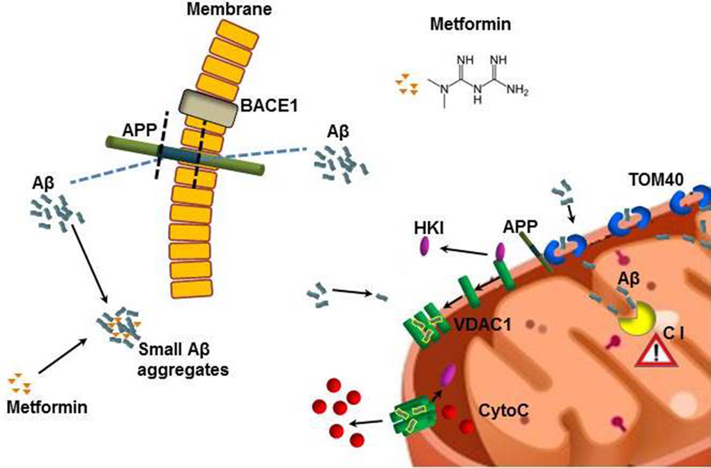 Furthermore, VDAC1 N-terminus has been found mediate the interaction of VDAC1 with anti-apototic proteins such as HKI [47], and VDAC1 oligomerization is considered relevant for interactions with proteins involved in apoptosis [46]. In the cortex region, where metformin-induced Aβ aggregates are accumulated, and apoptotic neurons were observed, a decrease in the amount of monomers and an increase of intramolecular crosslinked products with a concomitant increase in oligomers formation were found. Furthermore, decrease of HKI suggests that its binding to VDAC1 was displaced and the increased concentration of free VDAC1 molecules has promoted VDAC1 oligomerization. This is in line with the observation that Aβ mediated neurodegeneration involves detachment of HKI from VDAC1 that oligomerizes and promotes cytochrome C release, events leading to apoptosis [28]. Thus, the increased presence of Aβ, due to metformin treatment, could compete with the binding of HKI and/or other anti-apoptotic proteins with VDAC1 and be the apoptotic stimulus for enhancing VDAC1 oligomerization to produce enlarged pores capable to change permeability and mediate cytochrome C release, in critical brain region. In support of this observation direct interaction of Aβ and phosphorylated tau with VDAC1 has been demonstrated [27,28]. Aβ interaction is able to block mitochondrial pores and interfere with the transport of ATP, ADP and other metabolites between mitochondria and cytoplasm, leading to mitochondrial dysfunction and neurodegeneration [27]. Thus, the observed related increase of VDAC1, Aβ and apoptotic cells, due to metformin administration, mainly in the cortex, could be an initial neurodegenerative event that could be spread to other brain regions as the disease progresses. However, this concept need of additional experimental supports. Lastly, being mitochondrial dysfunction considered an early pathophysiological event in AD, TOM40 and VDAC1 may be proposed as potential timeline biomarkers for this pathology [49]. Consistent with data is the change in expression levels of TOM40 and VDAC1 mainly in cerebral cortex, in a very local specific manner. However, our observations suggest a strong association between metformin-induced Aβ accumulation and mitochondrial dysfunction via impaired TOM40 and VDAC1 expression that is cause of mitochondrial stress and, in turn, source of increased Aβ production. Because many of these factors can be either a cause or a consequence of the others, it is difficult to establish a clear sequence of events. Finally, we cannot exclude that the effect of metformin seen in brain of mice after three months of exposition could be exacerbated by the damage induced by the physiological aging. However, the potentiality of this drug to produce side effects could be counteracted, as suggested in other studies, by its use in combination with insulin [17,18,21].