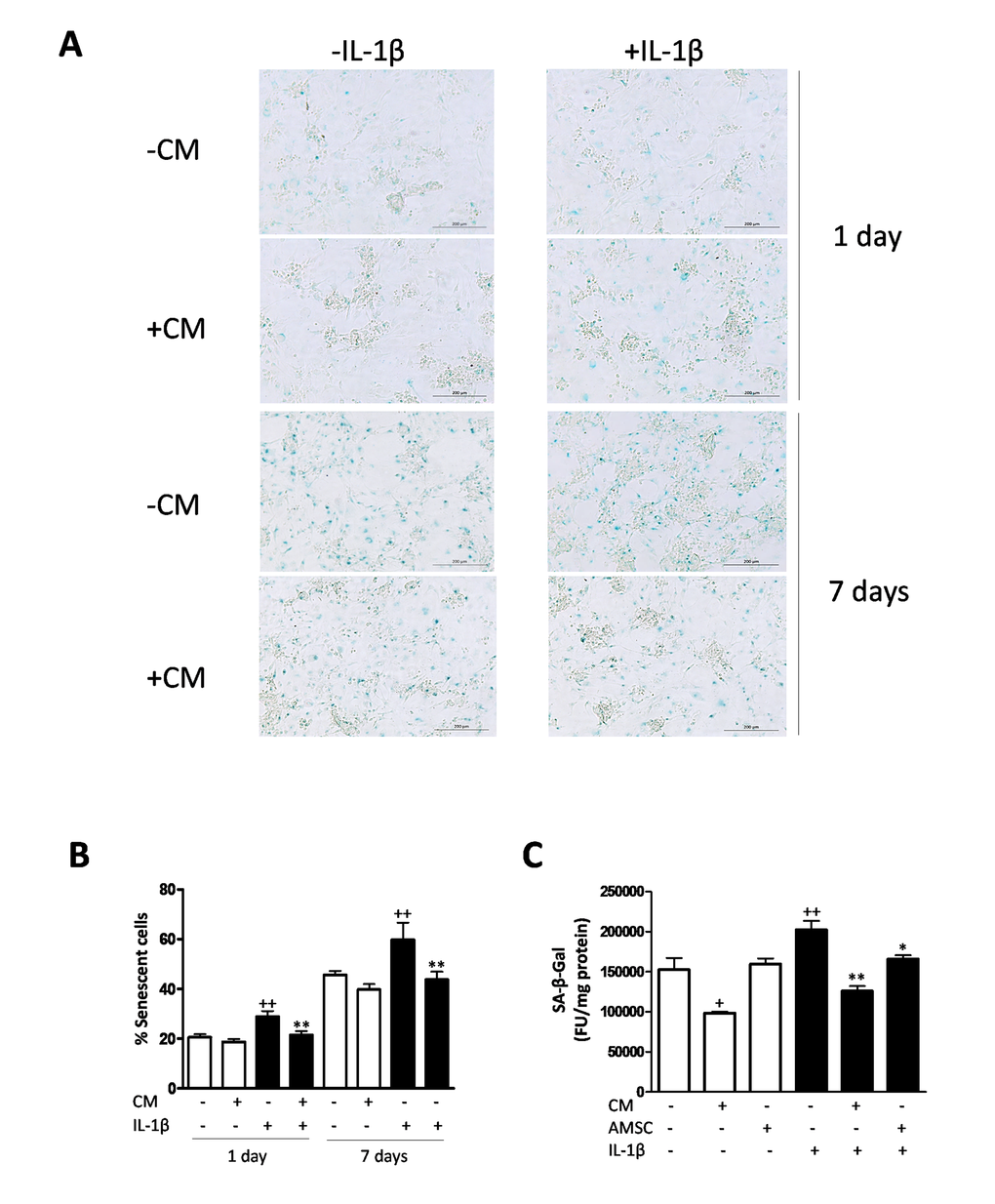 In order to characterize the effects of CM on senescence features of OA chondrocytes, we first assessed the marker senescence-associated β-galactosidase (SA-β-Gal). In primary chondrocytes, we observed that IL-1β induced a significant increase in the percentage of cells positive for SA-β-Gal at days 1 and 7 compared with non-stimulated cells (Fig. 1A and B). At both time points, CM treatment resulted in a significant reduction in the percentage of SA-β-Gal positive chondrocytes in the presence of IL-1β stimulation. The levels of SA-β-Gal staining became elevated at day 7 with respect to day 1 in all groups, which may be related to the higher cell density at day 7, as reported for human fibroblastic cells [24]. In addition, we studied the marker SA-β-Gal in a co-culture system of AMSC and OA chondrocytes and results were quantified by fluorometry in a micro-plate reader. As shown in Fig. 1C, the presence of AMSC significantly reduced the level of SA-β-Gal of OA chondrocytes induced by IL-1β stimulation. This assay confirmed the effect of CM on this marker which was significantly reduced even in the absence of IL-1β.