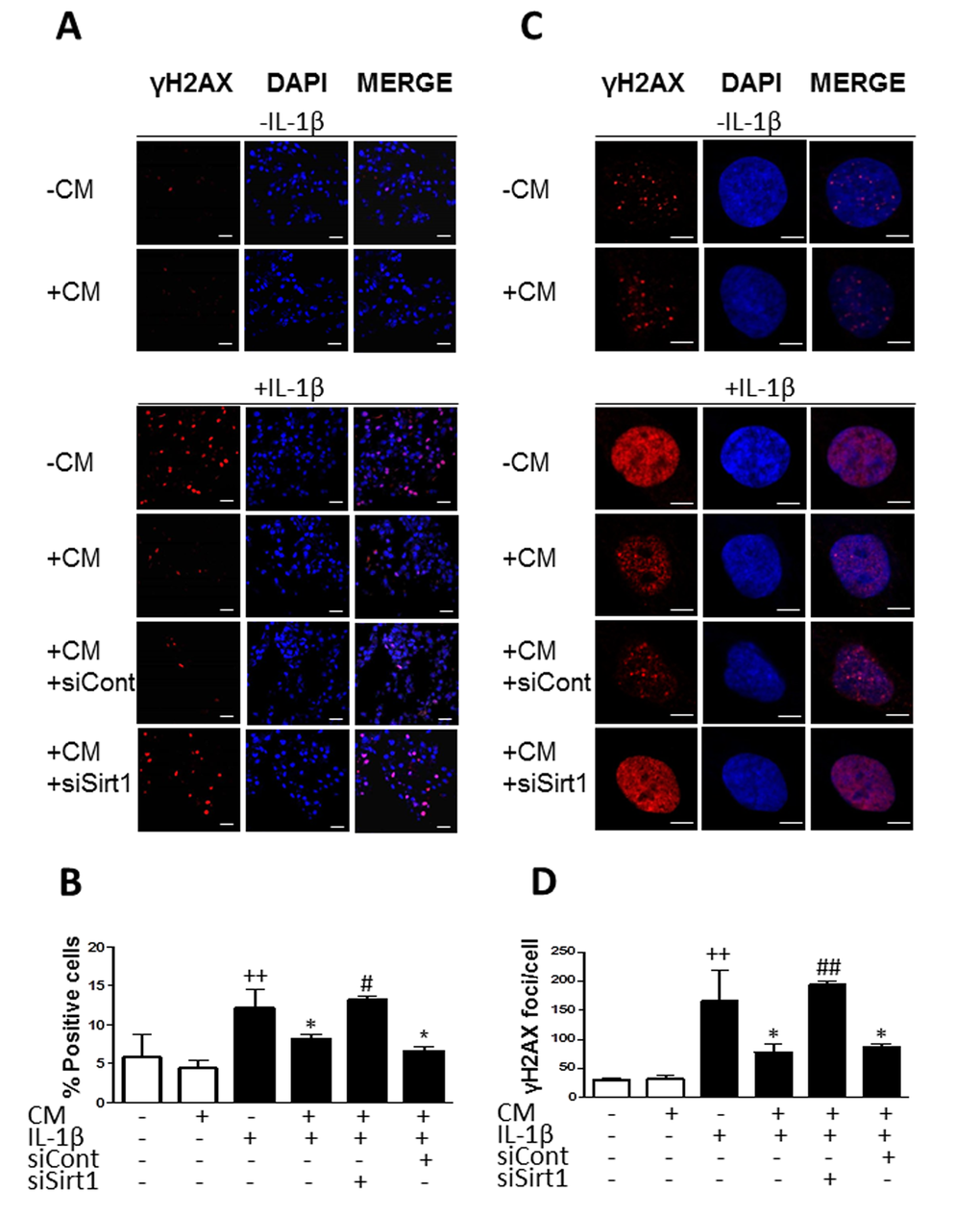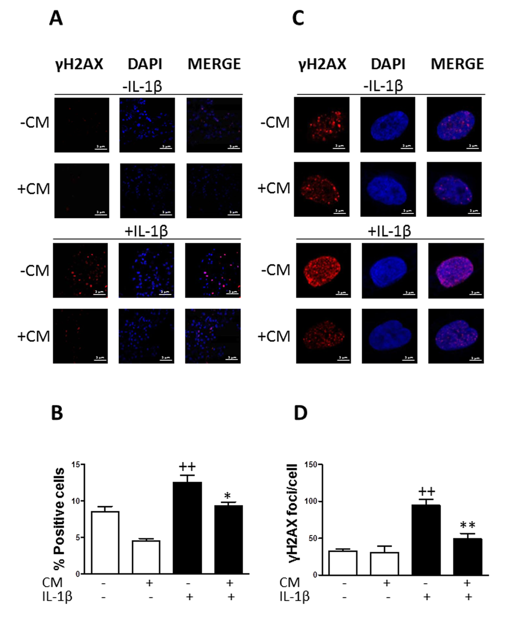 The presence of γH2AX foci correlates with age and chronic conditions connected with the accumulation of genome damage [25]. Immunofluorescence analyses showed a significant increase in the phosphorylation of the histone variant H2AX (γH2AX) in cells treated with IL-1β with respect to non-stimulated chondrocytes. Approximately 13% of cells positive for γH2AX (Fig. 2A and B) and 100 foci per nucleus (Fig. 2C and D) were detected in the presence of IL-1β after 3 days of incubation. At earlier times we did not observe any significant changes in the presence of this cytokine (data now shown). We investigated the effects of CM treatment and observed a significant reduction in the percentage of cells positive for γH2AX (of 30%) as well as in the number of γH2AX foci per nucleus (of 50%).