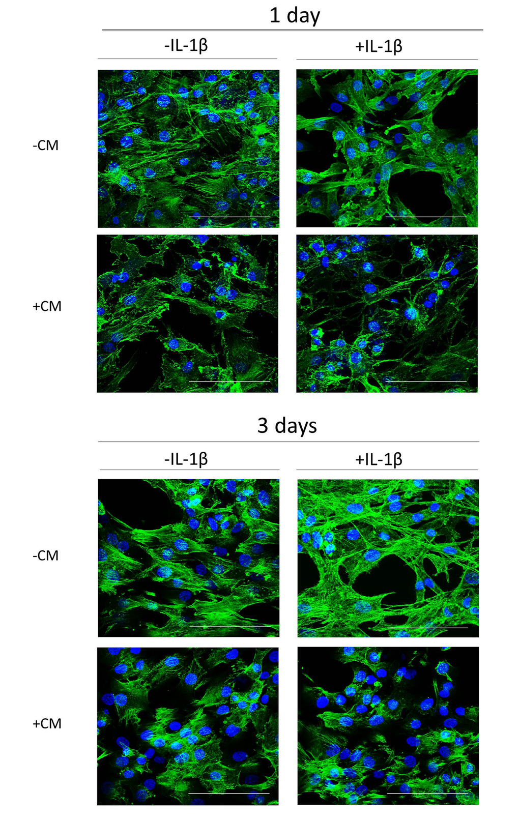 Chondrocytes in primary culture (20 x 103 cells/well) were seeded in Lab-tek chambers (Thermo Scientific), allowed to grow until near confluence, and stimulated with IL-1β (10 ng/ml) or IL-1β+CM for 1 or 3 days. Cells were fixed with 4% formaldehyde in PBS for 10 minutes at room temperature and blocked with 1% BSA in PBS for 20 minutes at room temperature. Cells were incubated with Alexa Fluor Phalloidin 488 (Molecular Probes, Invitrogen, Life Technologies) for 20 minutes at room temperature. Slides were mounted in Prolong Gold antifade reagent with DAPI (Molecular Probes) and examined under a confocal microscope (Olympus FV1000, Tokyo, Japan).