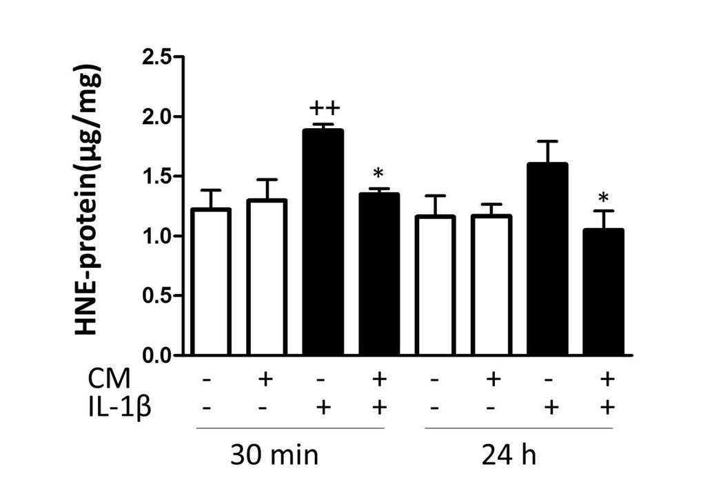 In human chondrocytes, oxidative stress may lead to DNA damage and senescence [26]. In addition, reactive oxygen species (ROS) production plays an important role in signaling pathways activated by IL-1β in human chondrocytes [27]. As oxidative stress is a key process in the induction and maintenance of senescence, we next investigated the effects of CM on protein modification by ROS. In OA chondrocytes, IL-1β quickly induced the production of ROS and enhanced levels of 4-hydroxy-2-nonenal (HNE)-modified proteins were detected (Fig. 4) whereas CM significantly reduced the amount of HNE-modified proteins.