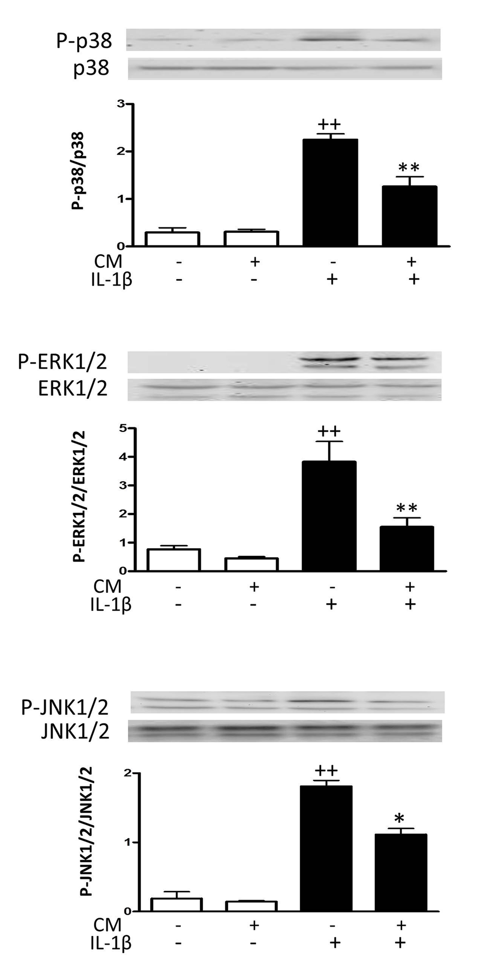 We next assessed the activation of signaling proteins that are involved in the oxidative stress response pathway. Fig. 5 shows that IL-1β quickly induced the phosphorylation of mitogen-activated protein kinases (MAPK) extracellular signal-regulated kinase 1/2 (ERK1/2), p38 and c-jun N-terminal kinase 1/2 (JNK1/2). Treatment of OA chondrocytes with CM significantly reduced the phosphorylation of ERK1/2 and p38 and to a lower extent the phosphorylation of JNK1/2.