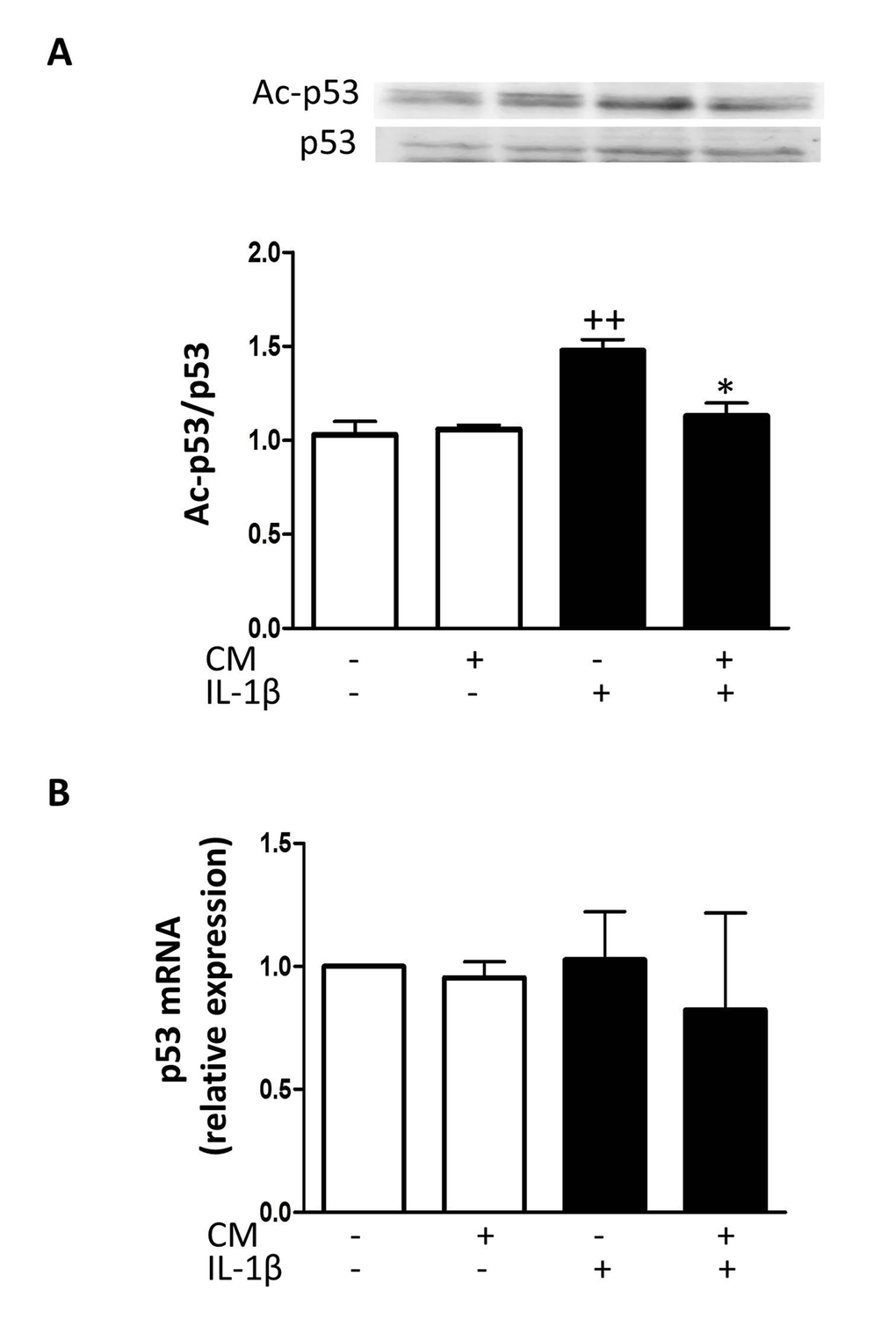 Cells in primary culture (27 x 104 cells/well in 6-well culture plates) were allowed to grow until nearly confluence and then treated with IL-1β (10 ng/ml) or IL-1β+CM for different times. Cells were lysed with buffer (1% Triton X-100, 1% deoxycholic acid, 20 mM NaCl and 25 mM Tris, pH 7.4) and centrifuged at 4ºC for 10 minutes at 10000 xg. Protein content was determined by the DC Bio-Rad Laboratories protein reagent (Bio-Rad, Madrid, Spain). Proteins (25 µg) in supernatants were separated by SDS/PAGE (12.5% gel) and transferred on to PVDF membranes. Membranes were blocked with 3% BSA and incubated with specific polyclonal antibodies against p53 (Novus Biologicals, Littleton, CO, USA), acetyl-p53 (ChemiconMillipore Iberica, Madrid, Spain), P-p38 (Promega Corp., Madison, WI, USA), p38, JNK1/2, P-JNK1/2, ERK1/2, P-ERK1/2 (Cell Signalling Technology Inc.) overnight at 4ºC. Membranes were incubated with peroxidase-conjugated goat anti-rabbit IgG (Dako, Copenhagen, Denmark); for p53 we used the secondary antibody anti-mouse IgG (Fc-specific)-peroxidase (Sigma-Aldrich). Finally, membranes with the immunoreactive bands were visualized by ECL® (enhanced chemiluminescence; GE Healthcare, Barcelona, Spain) using an AutoChemi image analyser (UVPInc., Upland, CA, USA).