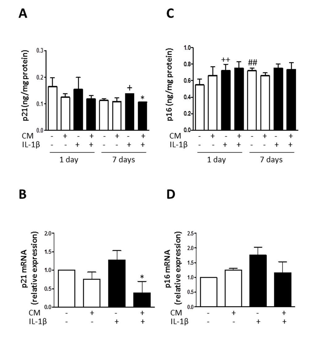Caveolin-1 overexpression leads to the up-regulation of the p53/p21 pathway which may mediate stress-induced premature senescence in OA chondrocytes [28]. Our results indicate that CM reduced the activation of this pathway by IL-1β, with a decrease in p53 acetylation and p21 expression. p21 levels increase in senescent articular chondrocytes and at earlier stages in the presence of chronic oxidative stress. In fact, p21 may represent a reliable marker of cumulative DNA damage and senescence in chondrocytes [26]. In addition, p16 may be involved in the processes of chondrocyte aging and OA [42]. Nevertheless, we have shown that p16 levels were not significantly modified by CM treatment, suggesting that this pathway may not be involved in the protective effects of CM on cellular senescence.