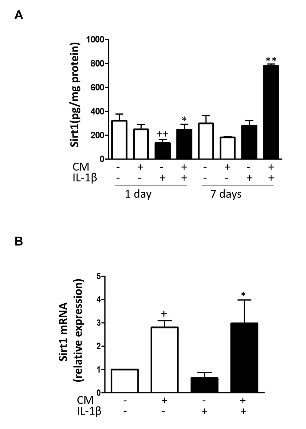 Cells were incubated for different times in DMEM/HAM F12 (Sigma-Aldrich) containing penicillin and streptomycin (1%) supplemented with 10% human serum, in the presence or absence of IL-1β (10 ng/ml) and/or CM (1 ml of medium for 6-well plates or 2 ml for 3.5 cm plates). In experiments using siRNA (32 nM), transfection was performed in Lipofectamine® RNAiMAX (Invitrogen, Life Technologies S.A., Madrid, Spain), following the manufacturer’s recommendations, 24 h before other experimental procedures. Efficiency of knockdown was monitored by quantitative RT-PCR and ELISA. Validated Stealth RNAiTM siRNA for Sirt1 and negative control were from Invitrogen.
