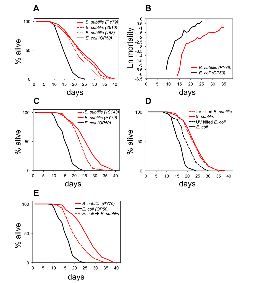 Feeding the gram positive B. subtilis to C. elegans instead of the gram negative standard laboratory diet E. coli considerably increases worm longevity [14,17,19,21]. To understand the nature of this life span increase we first examined whether it is B. subtilis strain-specific. We fed worms three different WT strains of B. subtilis (PY79, 3610, and 168) and compared their longevity to worms fed the standard E. coli OP50. Worms fed any of the B. subtilis strains lived longer (43%-58%) than E. coli fed worms (Figure 1A), thus feeding B. subtilis to worms extends their life span independently of the B. subtilis strain used.
