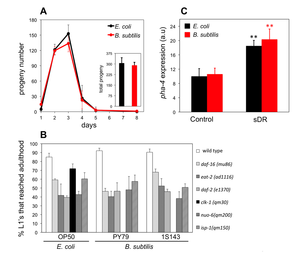 Three independent lines of evidence including the similar caloric content for B. subtilis and E. coli; the equal progeny number and developmental time to reach adulthood for worms fed B. subtilis or E. coli ; and the pha-4::mCherry nutritional biomarker response for worms fed either diet indicate that B. subtilis fed worms are not under the effects of dietary restriction and thus their longevity increase compared to E. coli fed worms must be due to some other reason.