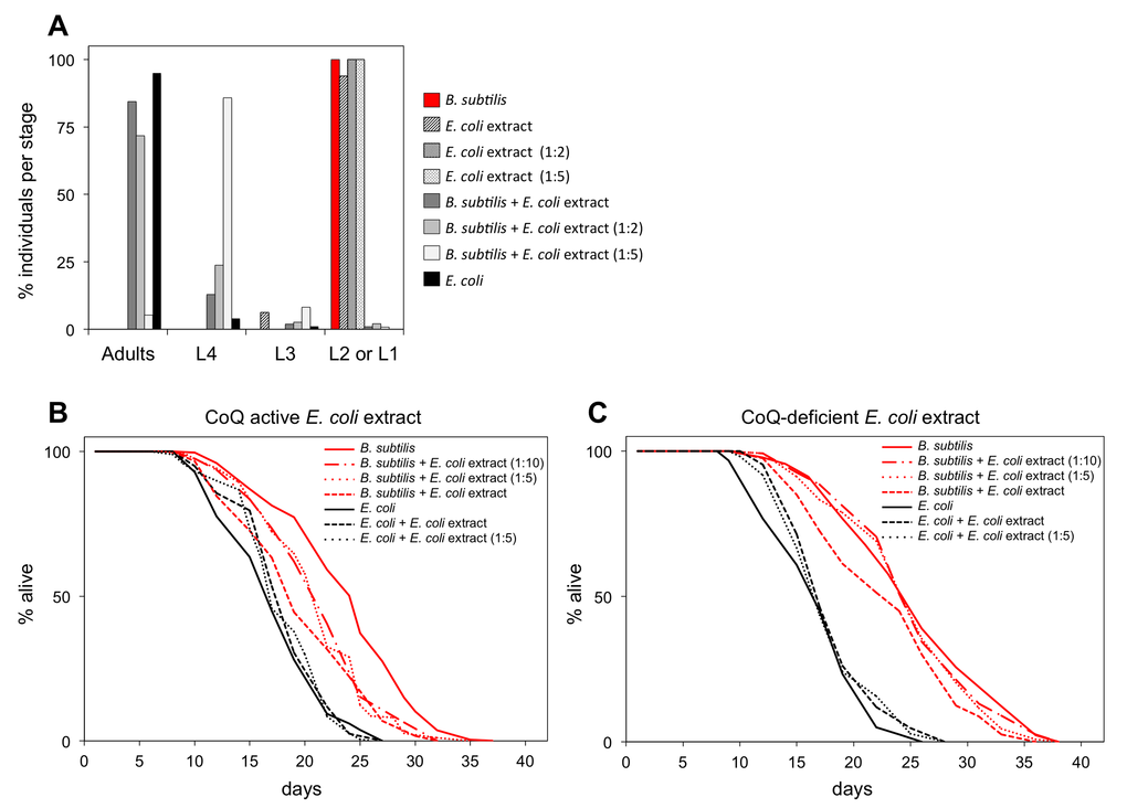 E. coli fed worms to which coQ-active E. coli extracts were added lived the same as E. coli fed worms (Figure 3B). Moreover, E. coli fed worms to which coQ-less extracts from either mutant E. coli or B. subtilis were added lived the same as E. coli fed worms (Figure 3C; Figure S5).
