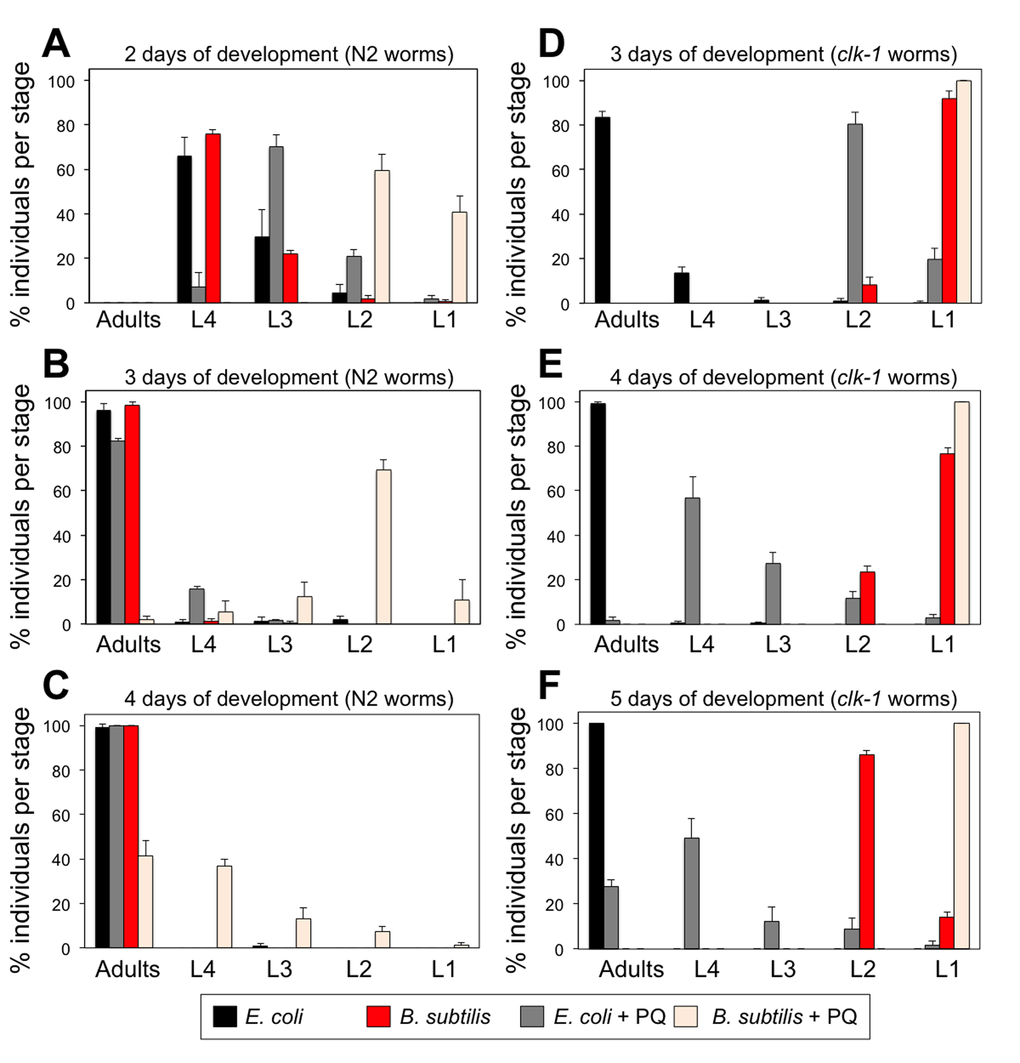 Besides being an essential ETC acceptor/donor of electrons, coQ is also a potent antioxidant [40]. C. elegans and E. coli, but not B. subtilis, synthesize their own coQ. Thus, worms that feed on E. coli are subjected to persistent dietary coQ supplementation and this may act as a lifelong antioxidant treatment for the worms affecting negatively their life span. To begin testing this possibility, we maintained WT L1 larvae on E. coli or B. subtilis seeded plates to which we had added a small concentration of the oxidant paraquat (PQ). If dietary coQ supplementation by E. coli indeed acts as an antioxidant, then it should counteract the effect of the oxidant. E. coli fed L1 larvae maintained on PQ containing plates suffered a minor developmental delay. However, B. subtilis fed L1 larvae maintained on PQ containing plates exhibited a severe developmental delay (Figure 4A-C). We performed the same experiment using coQ-deficient clk-1 worms. clk-1 L1 larvae maintained on E. coli seeded plates that contained PQ displayed a severe developmental delay compared with control E. coli fed clk-1 L1 larvae (Figure 4D-F). Although clk-1 L1 larvae are not able to complete development when maintained on B. subtilis, the arrested development phenotype was more severe when plates contained PQ (Figure 4D-F). After 14 days, the B. subtilis fed clk-1 L1 larvae had transitioned into sterile adults, whereas all the B. subtilis fed clk-1 larvae maintained on PQ plates continued arrested at L1 stage. The development in the presence of the PQ was also severely affected when WT larvae were fed a coQ-deficient E. coli diet (Figure S6). Our results show that worms with more coQ content such as E. coli fed WT worms, are able to better offset the oxidative effect of PQ and thus counteract the developmental delay induced by PQ.