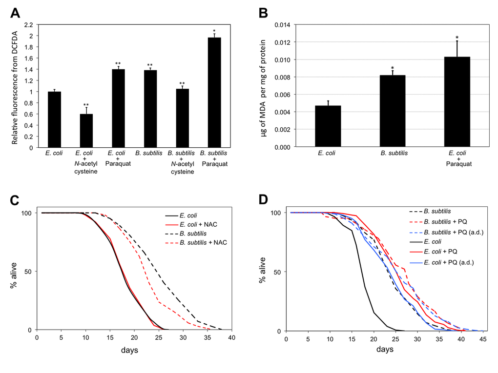 Despite living longer, B. subtilis fed worms have higher ROS levels than E. coli fed worms. An often-prevalent claim is that keeping cellular ROS levels low by using antioxidant treatments will reduce oxidative stress and consequently be beneficial for organismal health and survival [54]. Our data do not support this view but rather agree with recent reports that question the beneficial use of antioxidants [55,56]. For example, a recent study showed that lifelong antioxidant treatment accelerated mice lung cancer progression [56]. Additionally, a large human epidemiological review revealed that antioxidant supplements are not associated with lower all-cause mortality and that, at higher doses, certain types of antioxidant supplements may be associated with higher all-cause mortality [55]. Our findings posit that antioxidant supplementation affects cellular REDOX balance and alter proper cellular function. Thus, persistent antioxidant supplementation in humans might cause similar effects as those reported here for C. elegans.