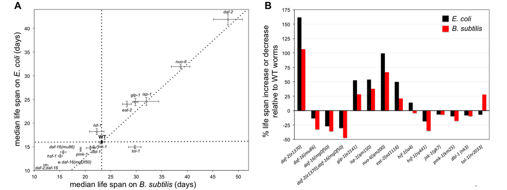 Mutations that lead to life span alterations when worms are fed E. coli do not always lead to proportional life span changes when worms are fed B. subtilis