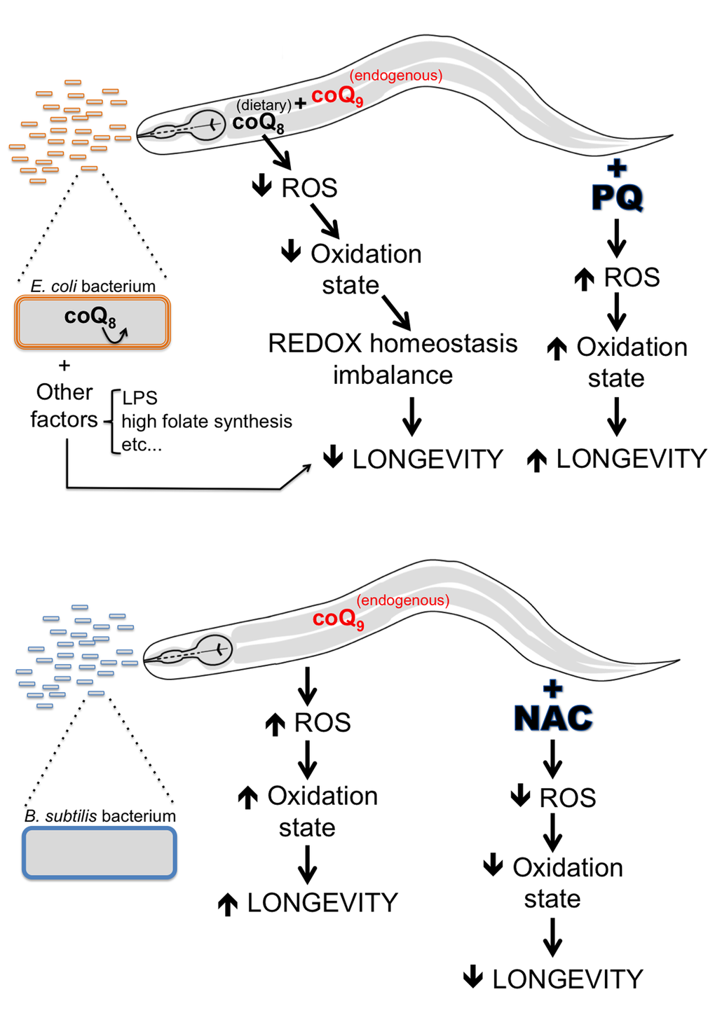 Our work demonstrates that the C. elegans life span difference observed when the worm diet is changed from the standard E. coli to B. subtilis is mainly due to the persistent antioxidant effect of coQ present in the E. coli diet. Contrary to E. coli, B. subtilis do not synthesize or use coQ. Dietary coQ-containing E. coli fed worms have lower cellular ROS levels and a less oxidized state than B. subtilis fed worms. We propose that this less oxidized cellular state of E. coli fed worms leads to an imbalance in cellular REDOX homeostasis, which in turn shortens their life span (Figure 7). According to the REDOX stress hypothesis of aging, altering the worm cellular REDOX homeostasis provokes alterations of ROS-dependent signaling pathways, as well as alterations of enzymatic reactions that are optimized for a particular cellular REDOX state [53]. Our findings highlight the impact that the microbiome can have on longevity, and argue that the excessive use of antioxidants can be detrimental.
