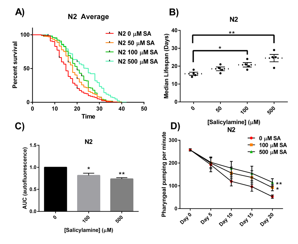 Nematodes grown on NGM-agar plates containing 0.5% peptone, were harvested, and eggs were isolated by alkaline hypochlorite with 0.5 N NaOH, 1% hypochlorite; 8 min at 23°C. The recovered eggs were rinsed in M9 buffer and placed on fresh agar plates seeded with E. coli strain OP50 and maintained at 20°C until late-L4/young adult stage. After the late L4/young adult molt, worms were transferred to peptone enriched 15 cm plates containing 0.12 mM FUDR, OP50 E. coli, and varying concentrations of SA. Salicylamine drug plates were made fresh before transfer by spreading SA on top of the agar and plates were allowed to dry. E. coli strain OP50 was exposed to UV radiation for 30 minutes to kill the bacteria before seeding onto the SA-FUDR NGM agar plates. Worms were exposed to SA throughout its life until harvest by transferring worms to fresh SA-FUDR-OP50 NGM plates every other day.