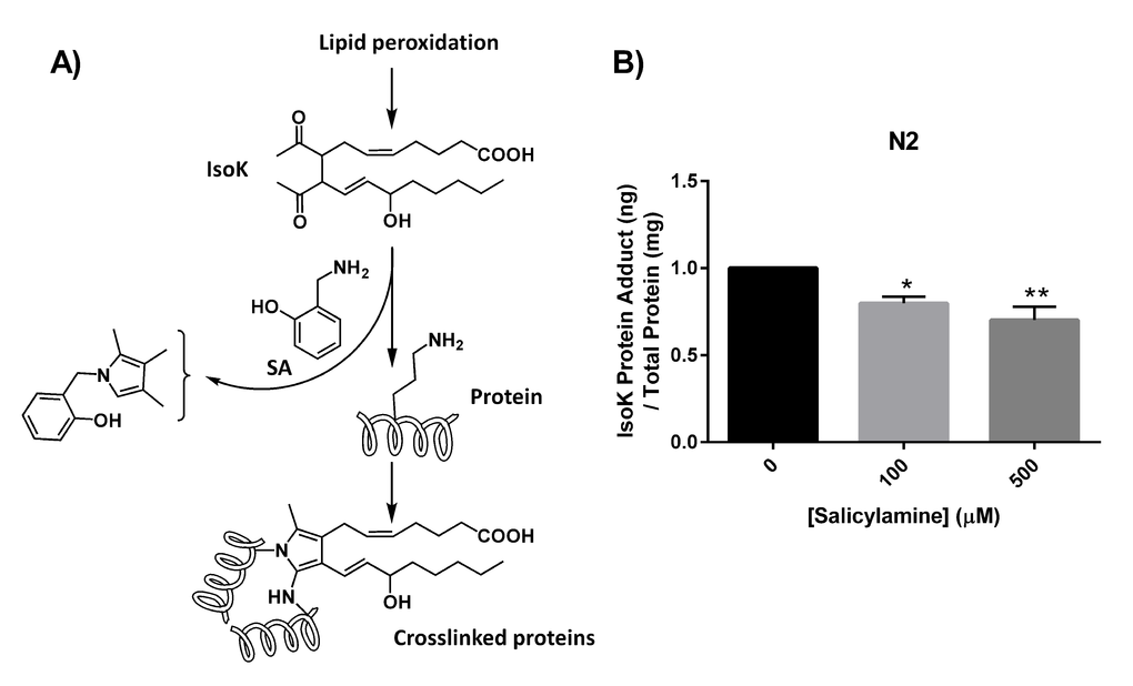 To better define the biological role of isoketals in oxidative injury and potentially prevent their detrimental effects, studies were performed to identify selective scavengers of IsoKs. A lead compound, pyridoxamine (PM) was identified through initial screens [19]. Structure-activity relationship studies identified the critical moiety to be a phenolic amine with the hydroxyl group adjacent to the methyl amine. Therefore, other phenolic amines such as salicylamine (SA) are similarly potent and as selective as PM for scavenging isoketals, but are more lipophilic. SA protects cellular viability in intact cells exposed to hydrogen peroxide, with SA pre-treatment leading to 5% occurrence in cell death, compared to 95% cell death in vehicle control treated cells, which suggests that IsoKs are major effectors of oxidative mediated death [20]. SA is orally bioavailable [21], and administering SA in mice prevents the age-related loss of working memory and the development of angiotensin II-induce hypertension [14,22]. Although preventing IsoKs from adducting to proteins has broad and remarkable beneficial biological effects, the precise molecular processes that are being altered by the IsoK scavengers are not clearly defined. More precisely, the potential role that IsoKs may play in the aging process, and how IsoK scavengers may be able to influence normal aging, is an open question currently.
