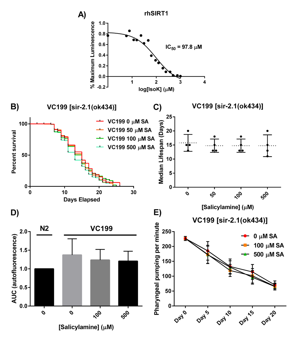 We next tested the hypothesis that, in vivo, SIR-2.1 is a critical protein that is functionally preserved from time-dependent oxidative inactivation when C. elegans are treated with increasing doses of SA. We treated a nematode strain carrying a non-functional SIR-2.1 mutation, VC199 [sir-2.1(ok434)], with the same concentrations of SA as were used in lifespan experiments with WT nematodes. Starting at day 1 of adulthood, SIR-2.1 mutants were grown on SA-coated OP50-seeded NGM plates. SIR-2.1 mutant worms were transferred to freshly made SA-OP50-NGM agar plates every 2 days and survival was assessed using a platinum wire until all worms died; survival was scored as movement upon slight touch with the platinum wire (Fig. 3B). When SA was administered to the VC199 strain, the effect of extending median lifespan that had been observed in the N2 strain was entirely abolished (Fig. 3C; VC199 median lifespan: 16 days, 0 μM SA; 15 days, 50 μM SA; 15 days, 100 μM SA; 15 days, 500 μM SA; p = 0.70). This suggests that SA-mediated lifespan extension acts in part through preservation of sirtuin activity. In addition, we observed SA-mediated lifespan extension operates outside canonical C. elegans longevity pathways, such as the insulin/IGF-1-like signaling pathway (Supplemental Figure 2).