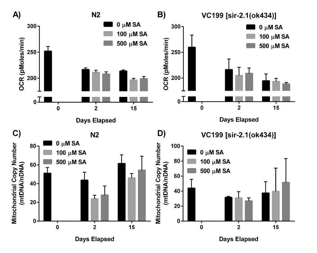 Mitochondria lie at the center of aging biology, playing crucial roles in energy production, carbon substrate metabolism, apoptosis regulation, and redox balance and signaling [66–68]. Since sirtuins play a major role in regulating mitochondrial function, we next wanted to investigate whether SA was exerting any of its effects via protection of mitochondrial processes. To investigate SA’s effects on mitochondrial respiration, we administered SA to WT N2 (Fig. 5A) and non-functional SIR-2.1 mutant worms (Fig. 5B) and measured oxygen consumption rate (OCR) in whole worms over several days. OCR decreased with age in both N2 and VC199 strains, and SA showed no effect on mitochondrial OCR in either strain (p > 0.05). We also examined the effect of SA treatment on mitochondrial DNA (mtDNA) integrity. Using a quantitative polymerase chain reaction (qPCR) assay to measure mtDNA content relative to nuclear DNA, WT N2 (Fig. 5C) and VC199 SIR-2.1 mutants (Fig. 5D) showed no significant difference in mtDNA copy number with age or with SA treatment. Taken together, these data suggest that the SIR-2.1 dependent effects of SA treatment are not mediated through significant changes in mitochondrial function.