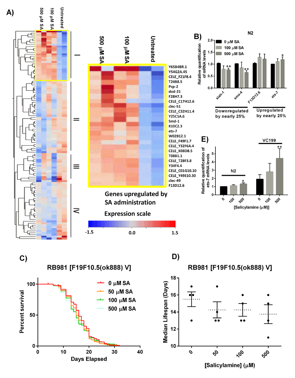 To investigate the role of ETS-7 in regulating lifespan downstream from salicylamine, SA was administered to the ets-7 gene knock-out strain, RB981 [F19F10.5(ok888) V]). Similar to the SIR-2.1 deficient VC199 strain, loss of ets-7 showed no SA-mediated effect on lifespan extension (RB981 median lifespan: 16 days, 0 μM SA; 15 days, 500 μM SA, p > 0.05) (Fig. 6C and 6D). We originally hypothesized that upregulation of ets-7 depends on SIR-2.1, which could result in enhanced longevity. In order to test this, we carried out real-time RT-PCR quantification of ets-7 in non-functional SIR-2.1 mutant nematodes treated with increasing doses of SA (Fig. 6E). Messenger RNA levels for ets-7 were increased by 32% in Day 15 WT N2 worms by 500 µM SA administration (p < 0.05), and similarly, a dose-dependent increase in ets-7 transcriptional level can be observed in Day 15 non-functional SIR-2.1 mutants, VC199, with the highest dose of SA showing a significant 442% increase in mRNA expression (p < 0.01). Taken together, these findings suggest that ets-7 upregulation in non-functional SIR-2.1 mutant may be an attempt at compensation for loss of SIR-2.1, which is further enhanced by SA-administration, but is ultimately insufficient in extending lifespan in the absence of SIR-2.1. Our data suggest that ets-7 is necessary for SA-dependent increase in lifespan, but is insufficient without the presence of functional SIR-2.1.