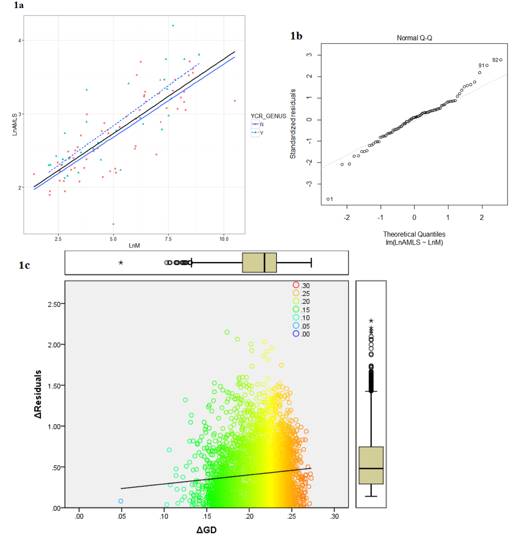 A liner regression model was created in R and used to calculate the residual values for each data point using natural logarithm transformed average body mass (in grams) and longevity (in years) for the 92 families. The outlying regression residuals were examined by quantile-quantile probability plot produced in R. In order to check for biased covariance of phylogenetic distance and longevity, the correlation between genetic distance between each family pair and the difference in residuals between them was calculated and is shown in Figure 1c.