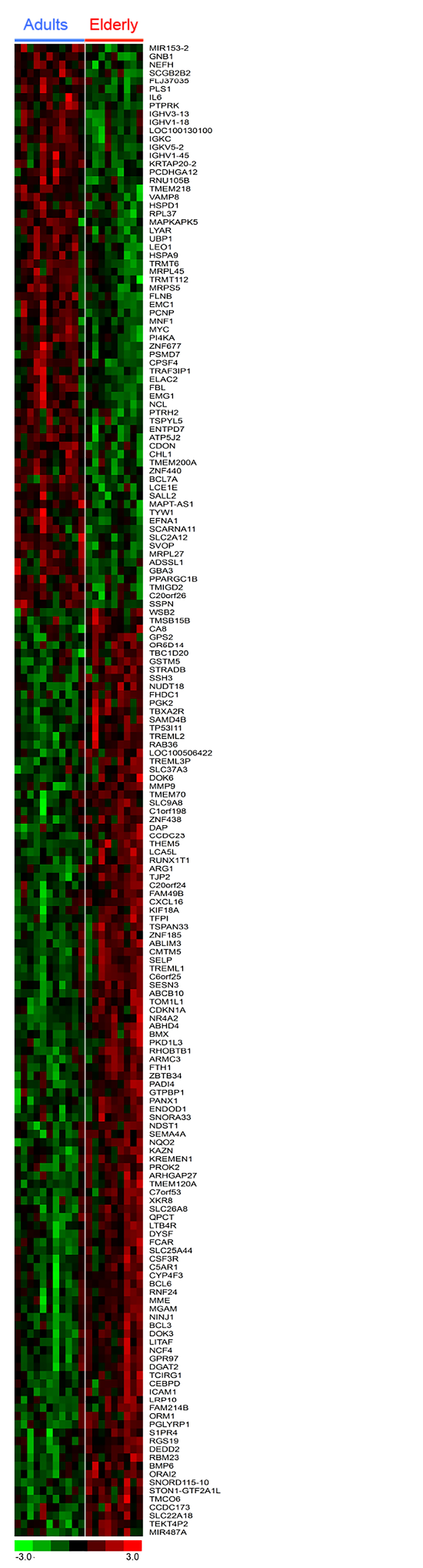 Identification of genes differentially expressed in blood samples from adults and elderly subjects