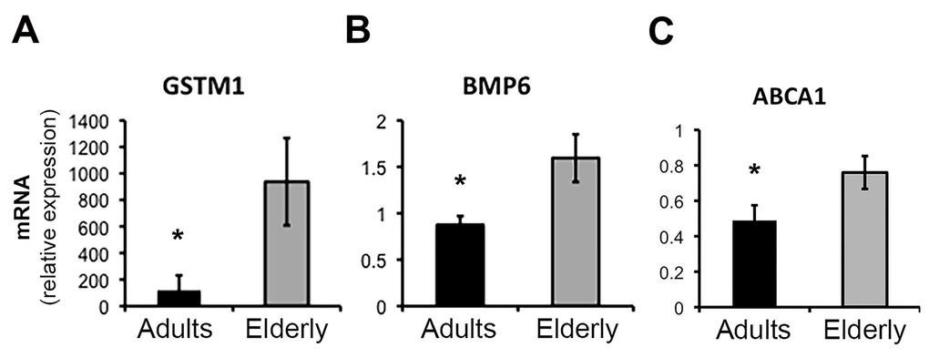 Total RNA was isolated from whole blood samples obtained in the morning, after overnight fasting. Gene expression was determined using whole-transcript arrays (Affymetrix HuGene 1.0 ST) and expression data were analyzed both at gene and pathways level. The elderly group showed increased the expression of 492 genes and decreased the expression of 418 genes (ANOVA p <0.05) (Table S1), by using a more stringent criteria (p < 0.01) the total number of differentially expressed genes was reduced to a more discrete 180 genes (112 upregulated e 68 down-regulated) (Table S1 and Figure 1). Only 4 genes were dysregulated more than 2-fold (GSTM1, CCDC23, TREML3P up-regulated; IGHV1-18 down-regulated) with aging. Changes of the expression levels of a group of representative genes were validated by qPCR (Figure 2A-C). Analysis of the gene list using DAVID [12] showed that the genes up-regulated in the elderly group shows that they are associated with categories such as Immunity and defense, Lipid, Fatty acid and steroid metabolism, Detoxification, Intracellular signaling cascade; whereas the down-regulated genes were associated with Protein biosynthesis and Protein folding (Table S2).