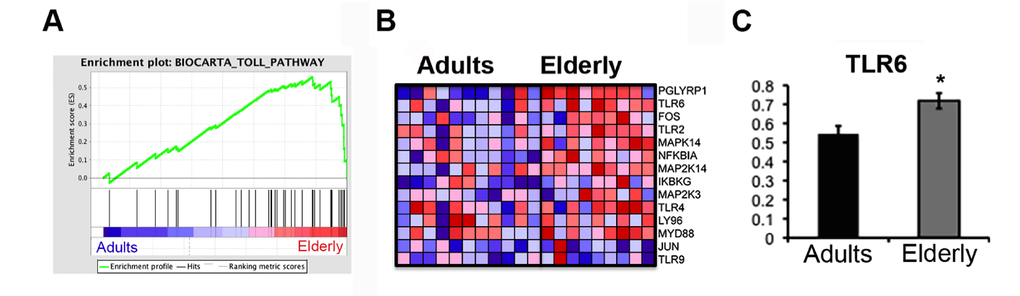 Genes with statistically significant differential expression between adults and elderly subjects were identified using two-way analysis of variance (ANOVA, p<0.05).