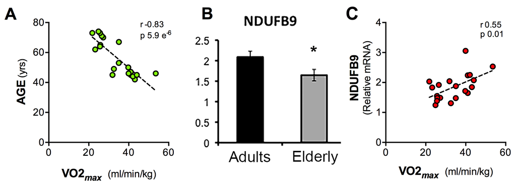 We asked whether these changes observed at the transcriptional levels in blood cells are associated with a global functional parameter of aerobic fitness, such as the maximum rate of oxygen consumption (VO2max), which declines in the elderly group (Figure 4A). We ran the GSEA using VO2max values as a reference parameter and were able to identify a number of pathways positively and negatively associated with VO2max (Table S3). Interestingly, a group of gene sets coding for mitochondrial respiratory chain components was positively and significantly associated with VO2max. For example, NDUFB9 expression levels, as determined by qPCR, were decreased in the elderly group (Figure 4B) and were significantly correlated with VO2max (r 0.55, p 0.01) (Figure 4C).