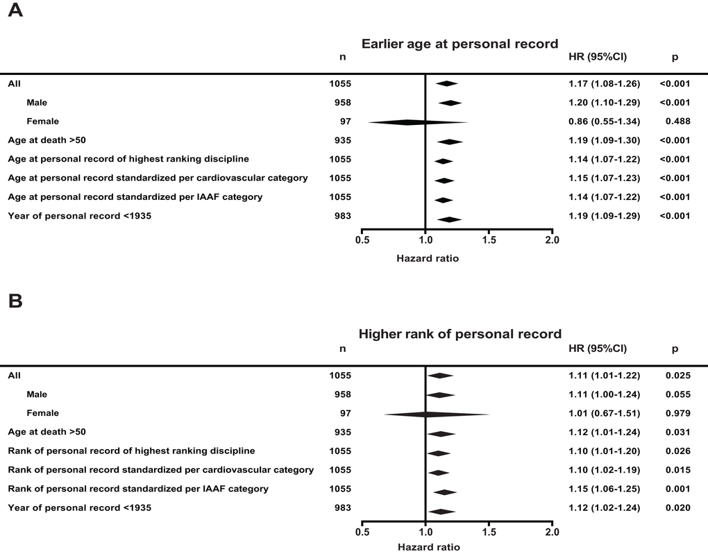 To compare peak performance of athletes from different disciplines and sexes we standardized age at, and rank of the personal record per discipline and sex. Athletes who had a peak performance one standard deviation earlier showed 17-percent increased mortality rates compared to those who reached their personal record later in life (95% CI 8-26%, P<0.001). Independent of the age of their personal record, athletes who ranked one standard deviation higher than their peers showed 11-percent increased mortality rates compared to those who were ranked lower (95% CI 1-22%, p=0.025).