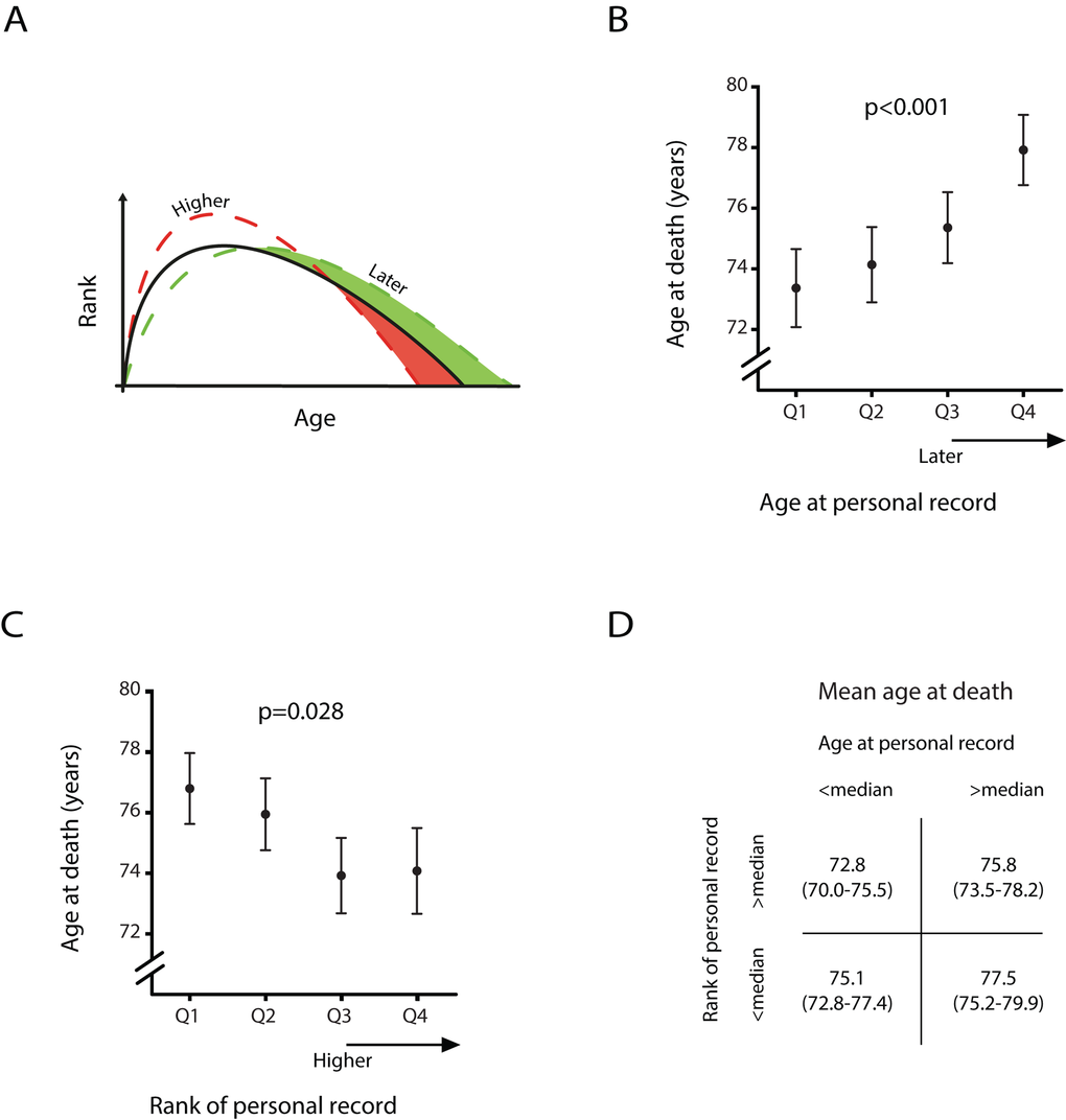 Life history regulation presumes a compromise between variations in the age at, and the extent of physical development and longevity (see Figure 2A) [19]. Figure 2 also presents the average age at death depending on the age and the rank of the personal record. Since hazard ratios of mortality for women were not significant associated with age or rank of personal record, the following estimates were calculated in males only. Male athlete’s age at death increased from 73.4 (SE 1.3) years in those who had their peak performance in the 25% youngest age range to 77.9 (SE 1.2) years in athletes who reached their personal record in the 25% oldest age range (panel B, p<0.001). Panel C shows the association between the rank of the personal record and the age at death. The age at death decreased from 76.8 (SE 1.7) years in those who had their peak performance in the 25% lowest ranks to 74.1 (SE 1.4) years in male athletes who reached their personal record in the 25% highest ranks (p=0.028). Panel D shows the joint effect of age at, and rank of the personal record. We found that the mean age at death was lowest (72.8, SE 1.4) for those male athletes whose personal record was in the earlier half of age and better half of rank. Male athletes who peaked at a later age and had a relatively minor rank died at a mean age of 77.5 (SE 1.2), resulting in a 4.7 (SE 1.4) year difference in life expectancy between the two groups (p=0.001).