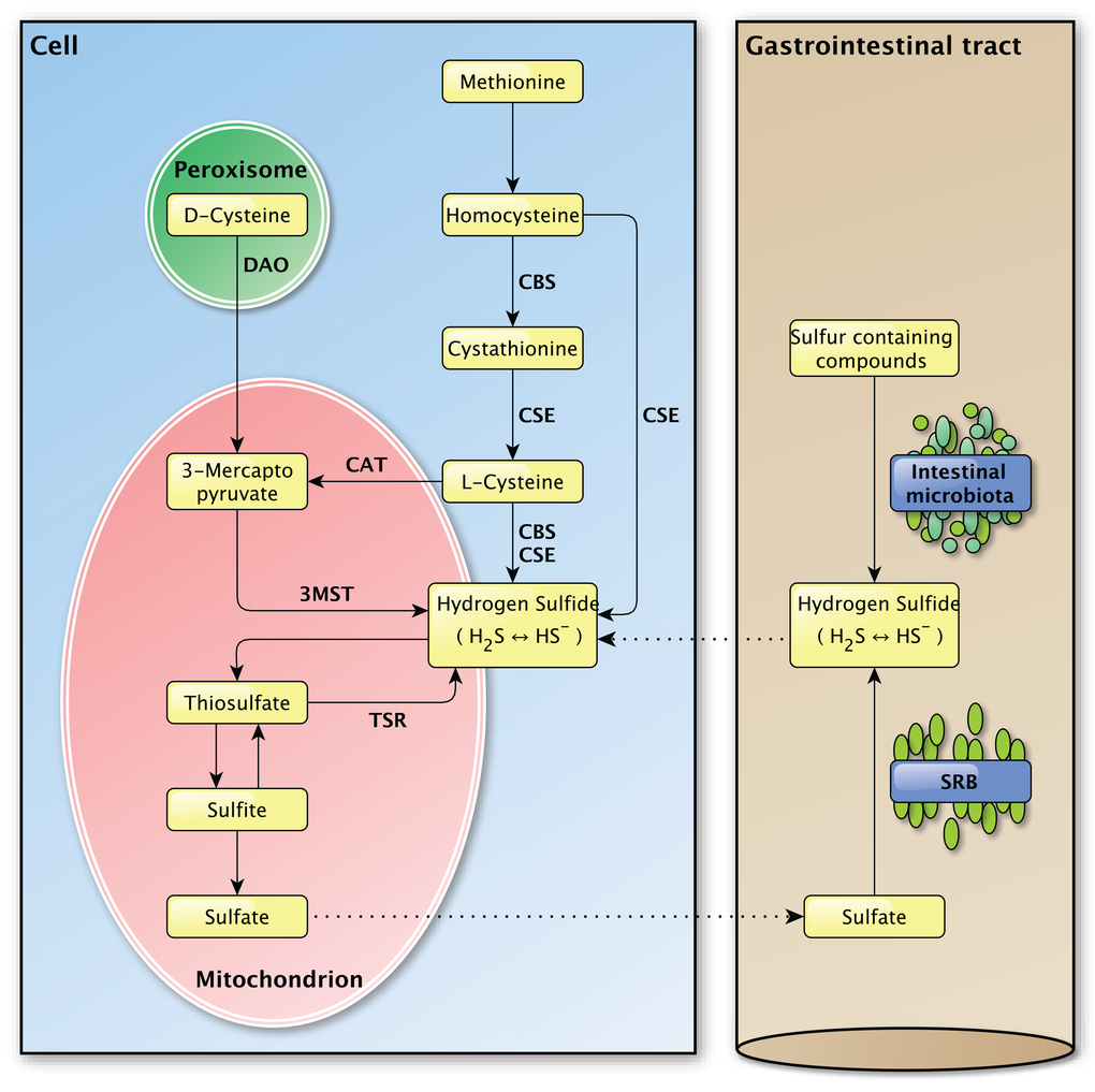 Aside from endogenous H2S production, H2S can be produced by bacteria in the mouth and the gastrointestinal tract (Figure 2). From the perspective of the host-organism, this H2S production is exogenous as it is produced by bacteria in the external milieu of the host and not by that organism itself. Sulfur-reducing bacteria, for example, are part of the normal intestinal microbiota in healthy individuals and have been identified in human feces [46]. Hydrogen sulfide is synthesized by these bacteria from alimentary as a consequence of their metabolic activity in which they use sulfate as a terminal electron acceptor [8,47]. The main source of this inorganic sulfate is the aliment, however the secretion of sulfate by the host gastrointestinal tract may also be an important source [48]. As the intestine is highly permeable to H2S [49], the production of high concentrations of H2S by these bacteria would be expected to cause severe tissue damage [50]. The exogenous production of H2S was also suggested to play a role in several pathologies of the intestinal tract, like inflammatory bowel disease and colorectal cancer, but direct links are yet to be established [51–53]. The intestinal mucosa is thought to protect the gastrointestinal tract against high concentrations of H2S by a specialized detoxification system which rapidly and effectively metabolizes H2S to thiosulfate and sulfate [8,50], whereupon sulfate can be secreted [48]. It is possible that defects in this detoxification pathway play a part in intestinal pathologies [49,50]. The importance of proper H2S catabolism is demonstrated in patients with ethyl-malonic encephalopathy, a disease in which malfunction of the persulfide dioxygenase ETHE1 results in multi-organ pathology in the brain, gastrointestinal tract and peripheral vessels for example [54]. Due to mutations in the ETHE1 gene [55], the inorganic sulfur catabolism is impaired which leads to the accumulation of H2S and various H2S-related toxic effects in different tissues [54,56,57]. Decreased exogenous H2S production, due to treatment with the antibiotic metronidazole, and improved H2S buffering, by administration of the glutathione precursor N-acetylcysteine, caused marked clinical improvements in patients with ethylmalonic encephalopathy [58]. The exact role of exogenously produced H2S in (patho-) physiology still needs to be determined and separated from the effects of endogenously produced H2S [53].