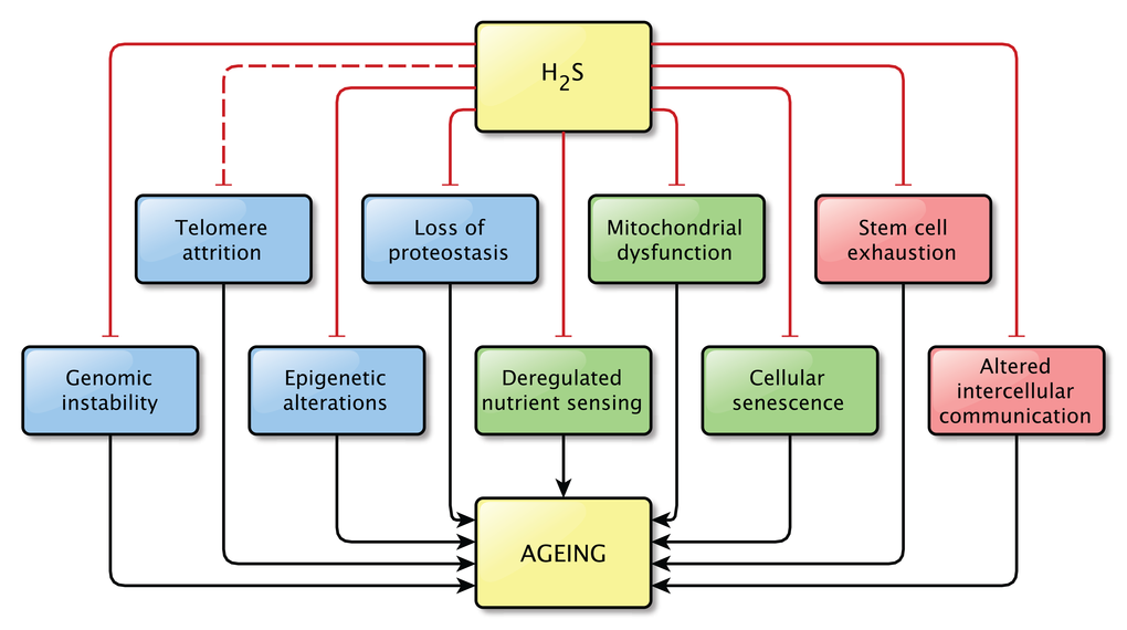 The precise relationship between H2S and aging still remains unknown. However, the findings discussed in this review strongly support the idea that H2S plays a role in the process of aging and in age-related pathologies, as direct effects on pathways related to aging were shown in all but one hallmarks of aging (Figure 3). It is possible that not all effects described here are important in the light of aging, but together they indicate that the contribution of H2S signaling to normal physiology and to pathophysiology is not to be neglected.