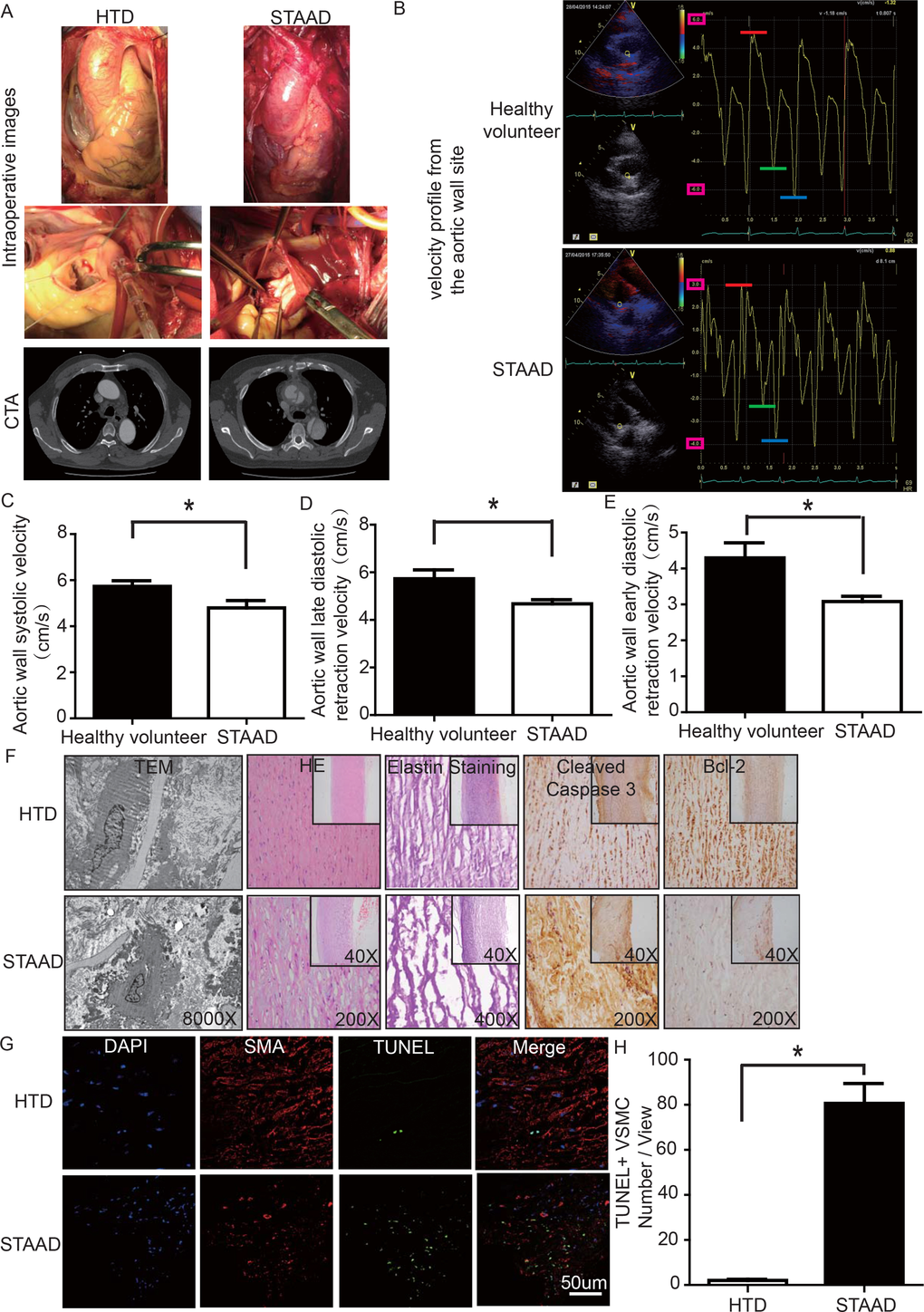 To determine whether there was a reduction of aortic wall elasticity, we collected samples from STAAD patients undergoing ascending aorta replacement and from heart transplantation donors (HTD). Representative computed tomography and intraoperative images of selected STAAD patients and HTDs illustrating typical STAAD features are presented in Figure 1A. The ascending aortas of STAAD patients were demonstrably enlarged according to the intraoperative images and computed tomography angiography (CTA) (Figure 1A); typical true and false cavities were observed using CTA (Figure 1A). We also compared the STAAD patients to age- and gender-matched healthy volunteers: echocardiography revealed highly significant maximum aortic wall velocity (Vmax) differences (including aortic wall systolic velocity, late diastolic retraction velocity and early diastolic retraction velocity) between healthy subjects (Figure 1B, C-E) and patients with STAAD (Figure 1B, C-E). The mean aortic wall systolic velocity of the ascending aorta was significantly lower (p=0.0417) in patients with STAAD (4.80±0.32 cm/s) than that in healthy volunteers (5.73±0.25 cm/s). The mean late- and early-diastolic retraction velocities of the ascending aorta were 5.73±0.37 cm/s and 4.30±0.42 cm/s, respectively, in healthy volunteers and 4.68±0.17 cm/s and 3.08±0.15 cm/s, respectively, in patients with STAAD (late, p=0.0478; early, p=0.0407).