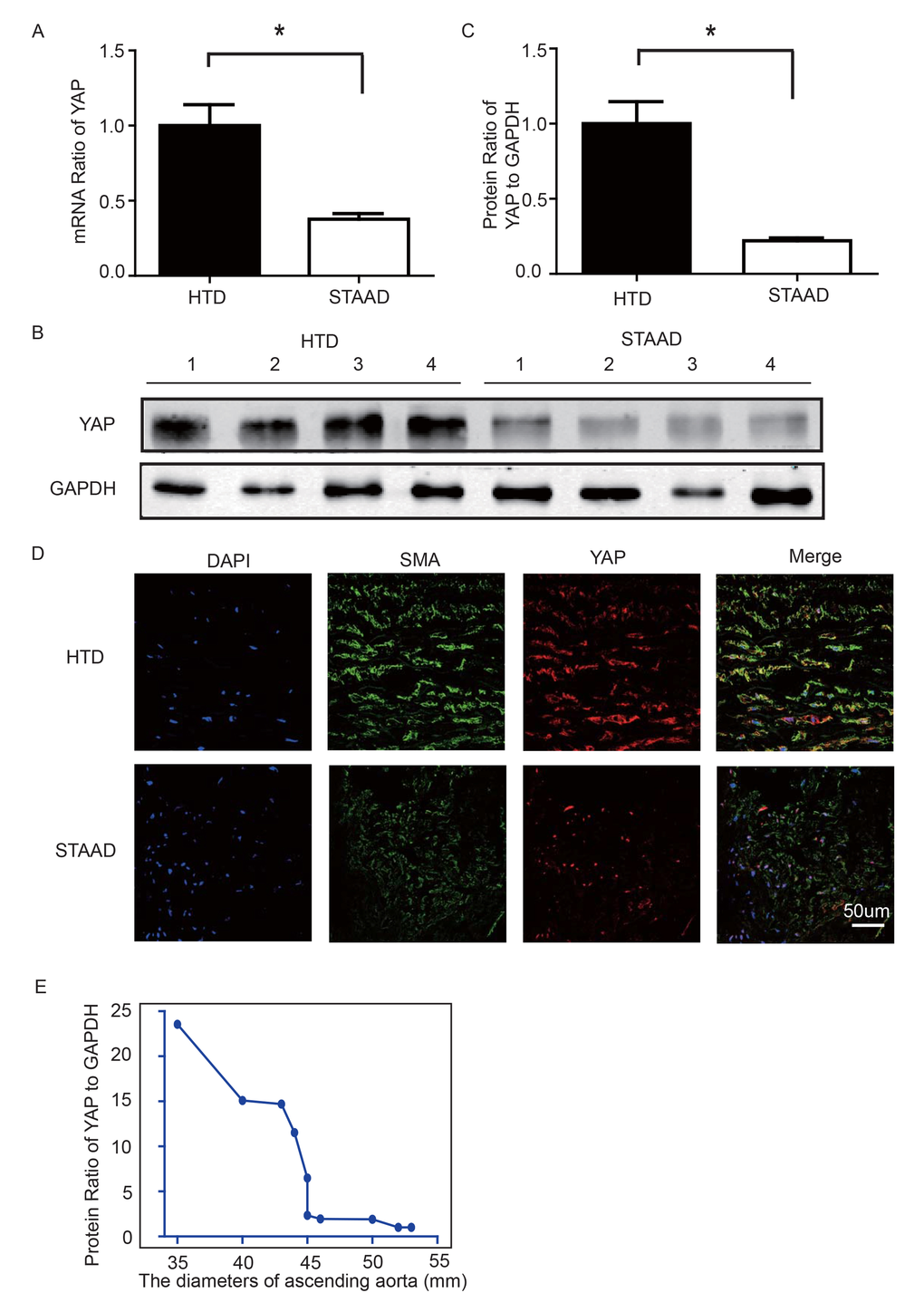 In this study, we investigated the relationship between YAP down-regulation and VSMC apoptosis during the development of STAAD. Furthermore, in a BAPN (β-aminopropionitrile monofumarate)-induced mouse STAAD model, we found that the changes in YAP expression observed in VSMCs are similar to those observed in clinical samples.