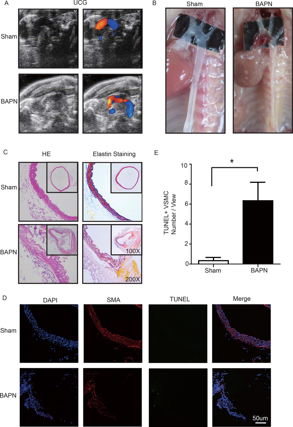 Lysyl oxidase (LOX), which crosslinks tropoelastin monomers to form elastic fibers, reportedly has a significant role in regulating ECM homeostasis [26]. Thus, BAPN (β-aminopropionitrile monofumarate, Sigma–Aldrich, St. Louis, MO), a LOX inhibitor, was used to build the model of aortic dissection in mice [4,27]. Through echocardiography and anatomical observation, we evaluated the ascending aortic dissection induced by BAPN after 4 weeks. After 4 weeks of BAPN treatment, the animal models presented with the features of STAAD, as shown in Figure 3A, B. We performed H&E and elastin staining and found VSMC disorganization and elastic lamella dissection that were similar to those observed in the clinical STAAD samples (Figure 3C). We also detected VSMC apoptosis in the ascending aortic wall of mice with BAPN-induced ascending aortic dissection based on TUNEL and α-SMA staining (Figure 3D, E). These results confirmed that the BAPN-induced mouse STAAD model successfully recapitulated the human phenotype, including ECM damage and VSMC apoptosis.