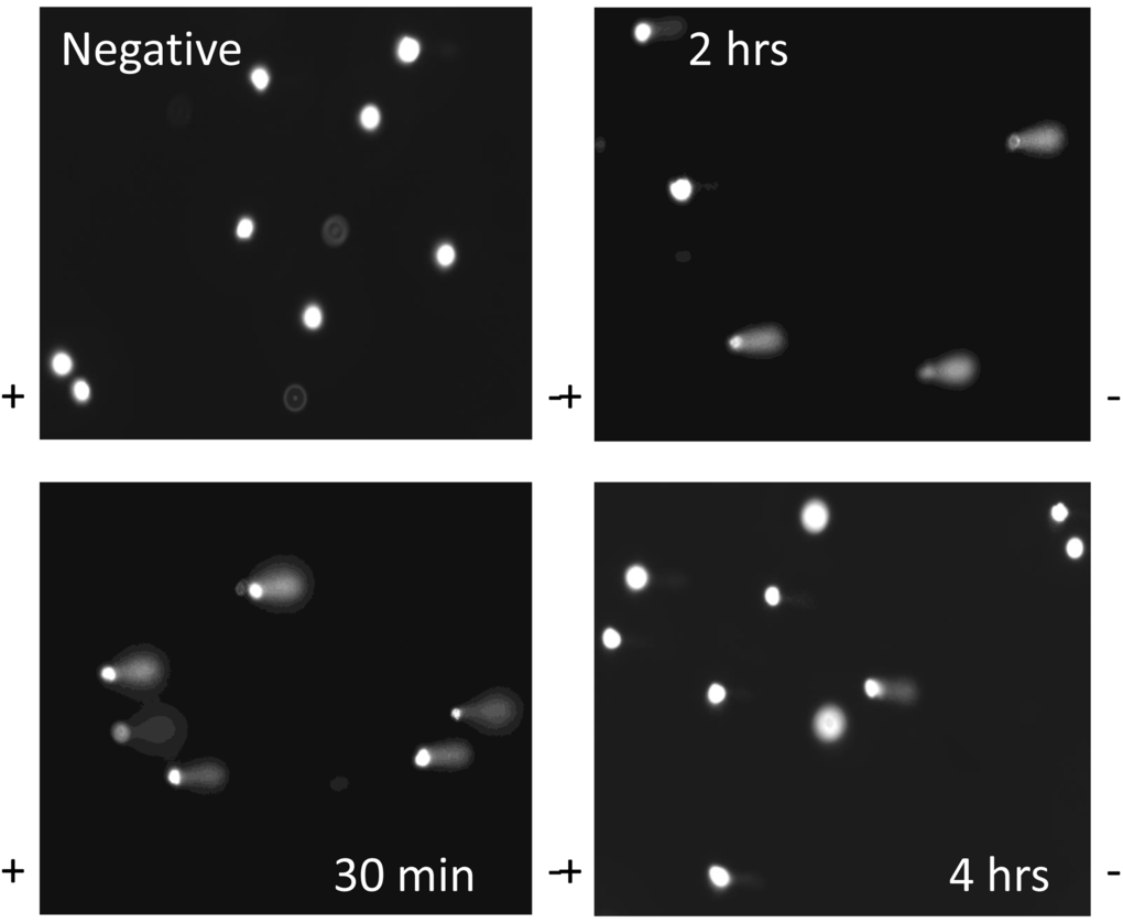 40,000 cells were seeded in a 12-well plate 24 hr prior to the beginning of the treatment. The next day, plates were placed under laminar flow and exposed to UV light for 30 min. As negative control (timepoint 0 hr), ADSCs were maintained in the incubator without exposure to UV light. Initial DNA damage was defined as damage at the 30 min timepoint while end DNA damage was defined as damage at the 4 hr timepoint.