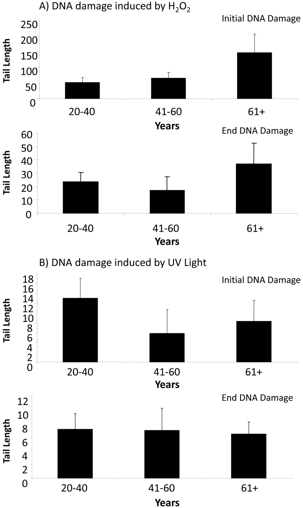 In response to UV light, ADSCs from younger donors displayed the longest tail length at the initial DNA damage timepoint. This difference was not statistically significant, however, and the measured tail lengths at both the initial DNA damage and end DNA damage timepoints were comparable for ADSCs from differently aged donors. At both the initial DNA damage and end DNA damage timepoints, the tail length in ADSCs treated with UV light was drastically smaller than the tail length in ADSCs treated with H2O2 (Fig. 2).