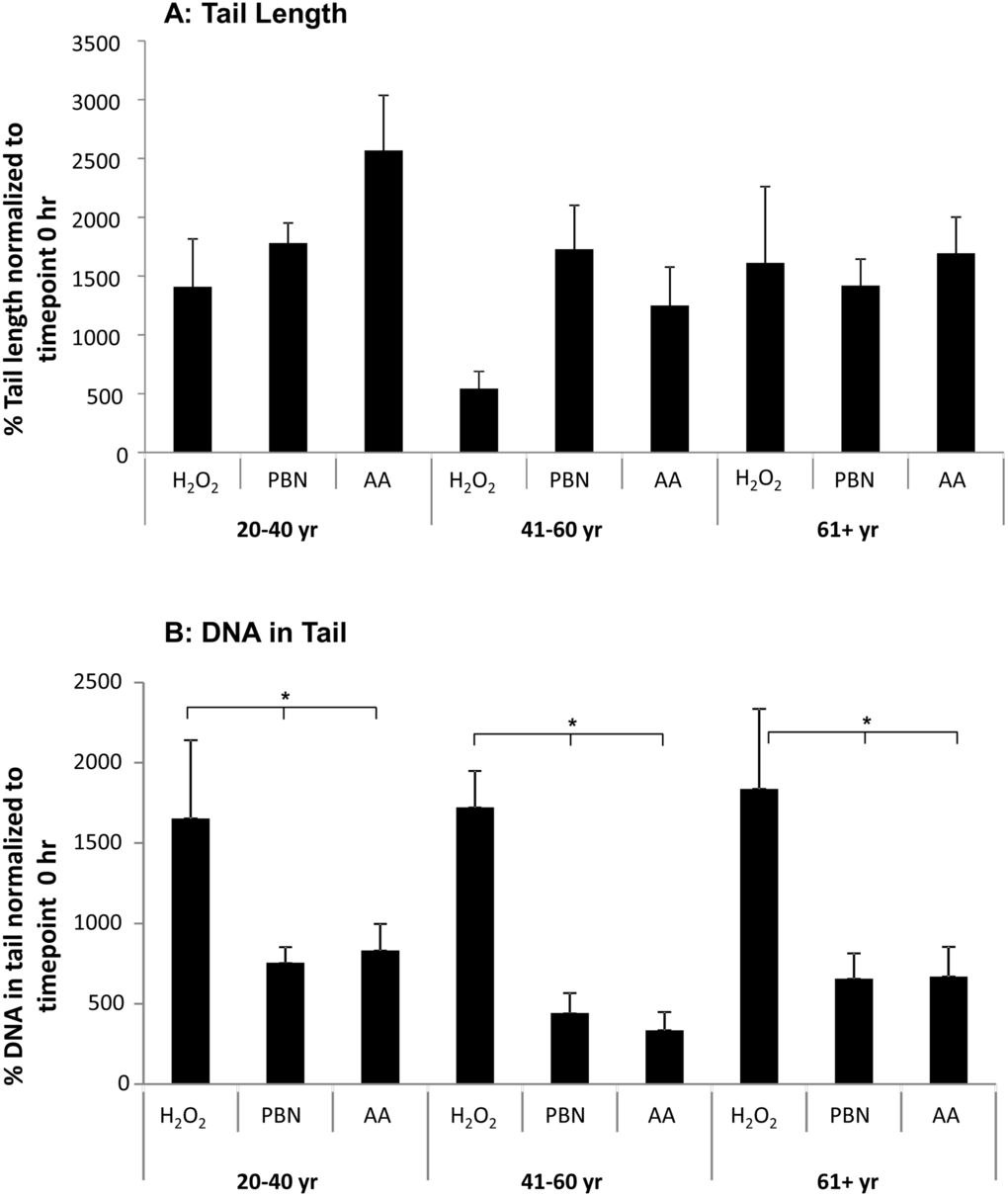 We find that treatment with either PBN or AA failed to significantly affect % tail length in H2O2-treated ADSCs (Fig. 3A). This prompted us to next measure % tail DNA, a comet assay parameter that is linearly related to the frequency of DNA breaks. Unlike tail length (Fig. 2A), both PBN and AA significantly reduced the % tail DNA in ADSCs from young, middle-aged, and older sources after 30 min of treatment with H2O2 (Fig. 3B).