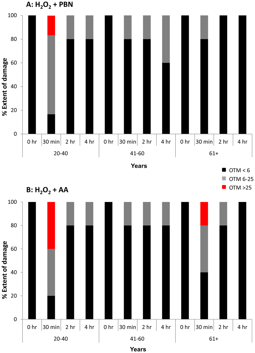 We next measured the olive tail moment (OTM) in ADSCs treated with H2O2 and PBN (Fig. 4A) or H2O2 and AA (Fig. 4B). The OTM is a comet assay parameter equal to the product of tail length and the fraction of total DNA within the tail. At the 0 hr timepoint, 100% of the measured OTM was very low (<6), which is indicative of little to no DNA damage (Fig. 4). In general, the OTM in ADSCs derived from differently aged populations at each timepoint was quite low (<6). Some portions of the population showed mid-range OTMs between 6 and 25. At the 30 min timepoint, a portion of ADSCs from young sources displayed OTMs >25 for both the H2O2 and PBN (Fig. 4A) and H2O2 and AA (Fig. 4B) groups. At the 30 min timepoint, a portion of ADSCs derived from humans aged 61+ also displayed OTMs >25 for the H2O2 and AA group (Fig. 4B). In general, however, ADSCs treated with H2O2 and either PBN or AA showed minimal OTMs (Fig. 4), which is indicative of minimal DNA damage in the presence of these protective agents.