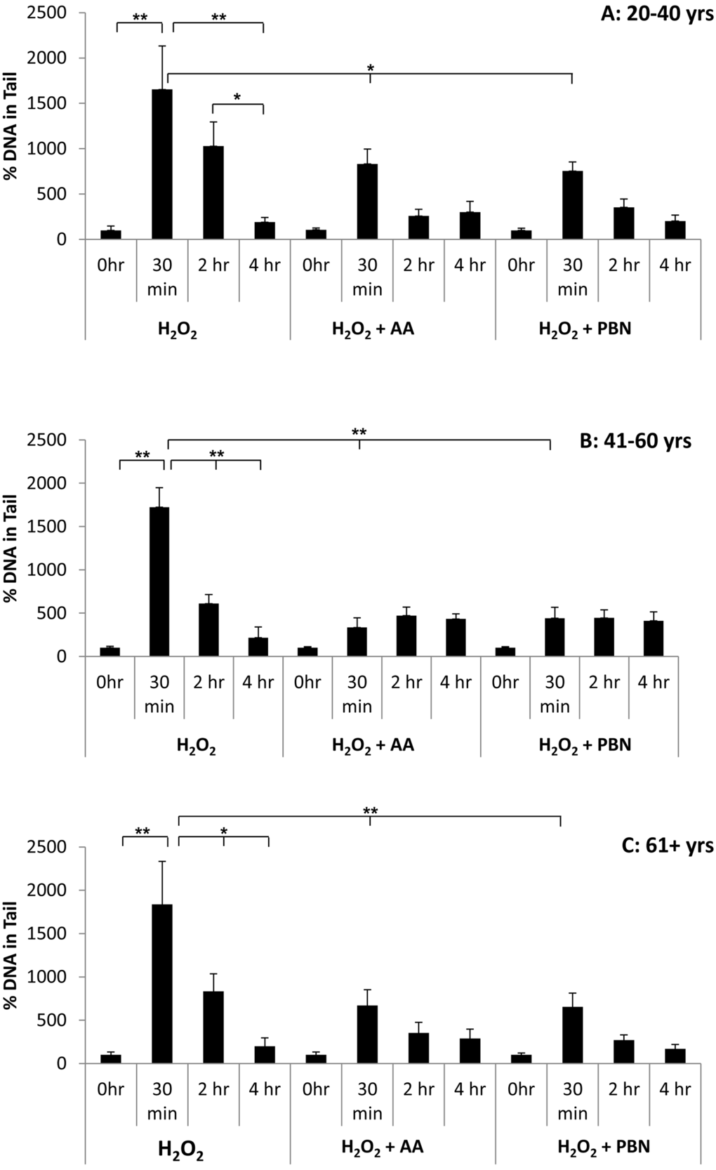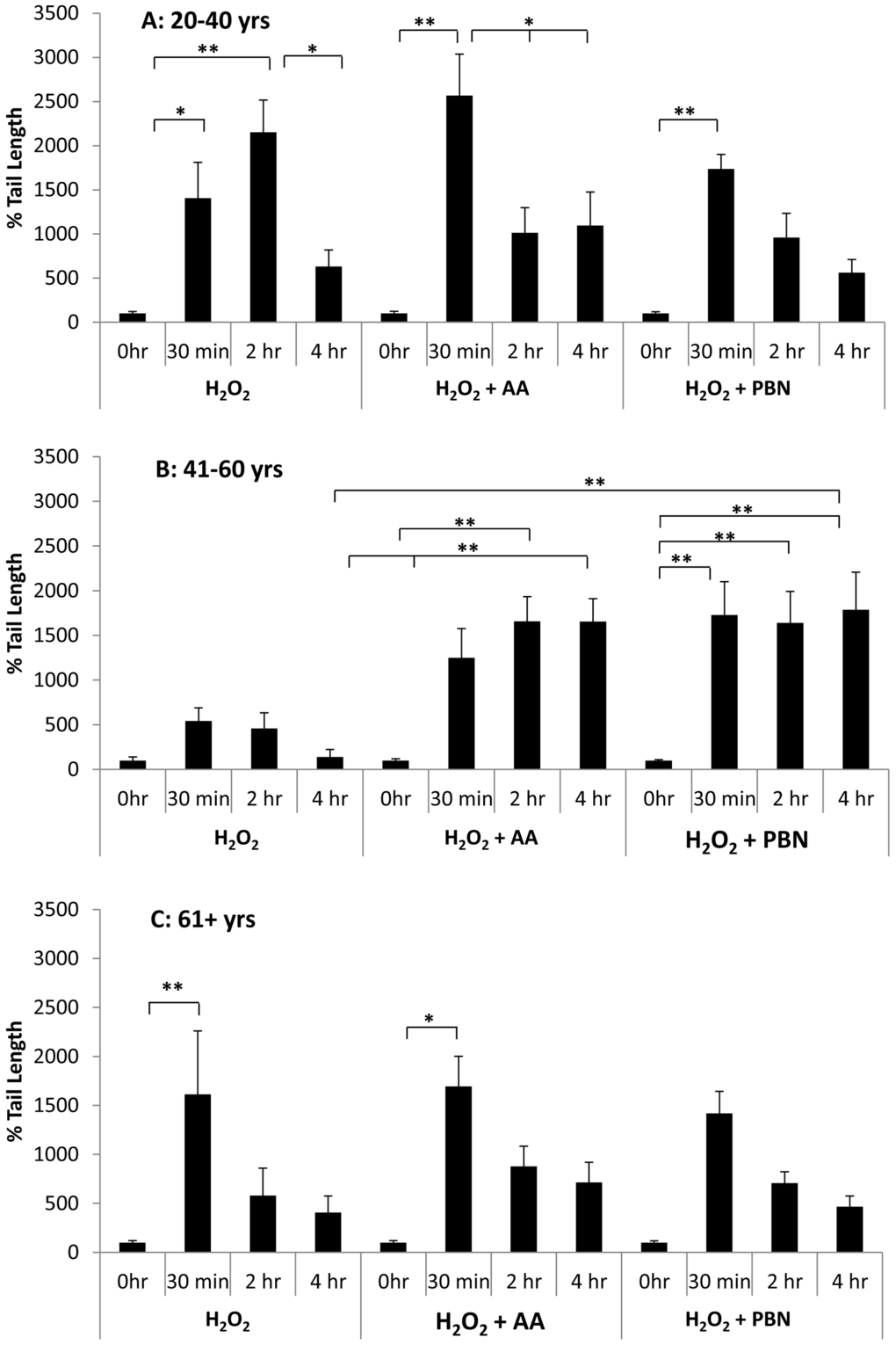 We find that, in young ADSCs (Fig. 5A), H2O2 induces a significant increase in % tail length at the 30 min and 2 hr timepoints. After 4 hrs, the % tail length significantly drops to a level similar to the 0 hr timepoint control (Fig. 5A). In response to treatment with AA, % tail length again significantly increases at the 30 min timepoint. % tail length then significantly decreases at the 2 hr and 4 hr timepoints, returning to levels statistically comparable to the control (Fig. 5A). After treatment with PBN, % tail length significantly increases at the 30 min timepoint but then decreases at the 2 hr and 4 hr timepoints (Fig. 5A). For middle-aged ADSCs (Fig. 5B), treatment with H2O2 alone did not significantly increase % tail length at any of the timepoints measured. In response to treatment with AA or PBN in addition to H2O2, however, a significant increase in % tail length was observed at all timepoints compared to 0 hr controls (Fig. 5B). Moreover, the % tail length in ADSCs treated with H2O2 and AA or H2O2 and PBN was greater than the % tail length in ADSCs treated with H2O2 alone at the 4 hr timepoint (Fig. 5B). In older ADSCs, the % tail length significantly increased at the 30 min timepoint in response to H2O2 or H2O2 and AA (Fig. 5C). Otherwise, the % tail lengths measured were statistically comparable to the 0 hr timepoint (Fig. 5C).
