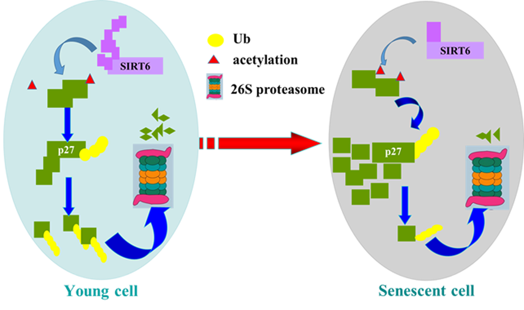 In summary, our study suggest a new molecular mechanism for SIRT6 delaying cellular senescence. When cells are young, SIRT6 decreases the acetylation level of p27, which promotes p27 degradation by proteasome. The acetylation level of p27 increases with the decline of SIRT6, which improves the stability of p27 and induces cellular senescence (Figure 10). Our findings may provide a new way to resist cellular senescence and to delay aging related diseases.
