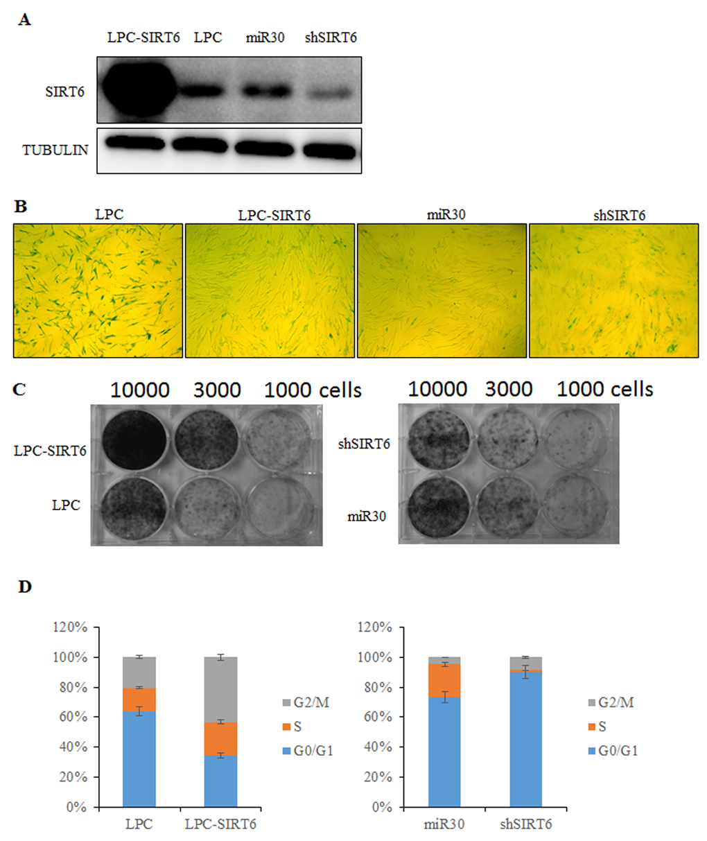 Another hallmarker of senescent cells is the ability of colony formation. We observed that 2BS cells overexpressing SIRT6 formed more colonies than control cells. However, SIRT6 shRNA-infected cells showed less colonies compared to control cells (Figure 2C).
