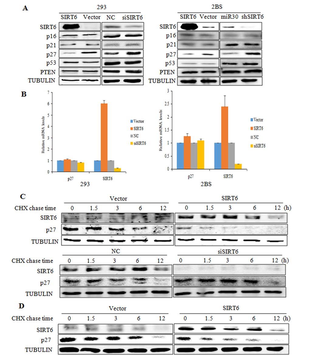 We then examined the molecular mechanism underlying SIRT6-induced delay in cellular senescence. p16, p21, p27, p53 and PTEN play important roles in cellular proliferation, the influences of SIRT6 on these key factors of cellular senescence were determined. We first analyzed the expression patterns of these proteins using western blot analysis and real-time PCR. As shown in Figure 3A, the protein levels of p27 were markedly depressed in SIRT6-transfected 293 cells as compared with the vector-transfected cells, whereas the protein levels of p16, p21, p53 and PTEN were not altered. In addition, SIRT6 silencing did not alter the protein levels of p16, p21, p53 and PTEN, but markedly increased p27 protein levels. Moreover, the real-time PCR analysis demonstrated similar p27 mRNA levels in both SIRT6-overexpressing and knockdown cells, suggesting that SIRT6 might decrease the p27 protein levels but not the mRNA levels. Similar results were also observed in 2BS cells (Figure 3A and 3B).