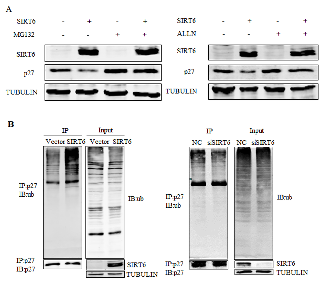 We subsequently examined whether SIRT6 promoted the degradation of p27. As shown in Figure 4A, SIRT6-mediated down-regulation of the p27 protein was prevented by two different proteasome inhibitors, MG132 and acetyl-Leu-Leu-norleucinal (ALLN) suggesting that SIRT6-mediated downregulation of the p27 protein might be proteasome-dependent. Then we tested the potential role of SIRT6 in the polyubiquitination of p27 in 293 cells. As shown in Figure 4B, overexpression of SIRT6 promoted the ubiquitination of p27, whereas knocking-down SIRT6 decreased the ubiquitination level of p27. These results indicate that SIRT6 induces the polyubiquitination of p27 and subsequently promotes its degradation.