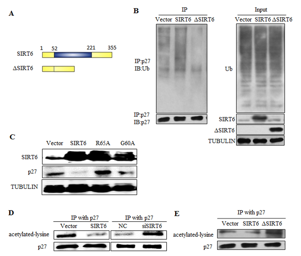 The following antibodies were used for the Western blot analysis: anti-SIRT6 (Abcam, CST), anti-Multi Ubiquitin (MBL), anti-FLAG (Sigma), anti-Myc (MBL), anti-p27 (MBL, Santa), anti-GAPDH (Tianjin Sungene Biotech Co., Ltd.), anti-β-TUBULIN (Santa), anti-p21 (MBL), anti-p53 (Santa), anti-p16 (Santa), anti-PTEN (Santa), anti-acetylated lysine(CST).