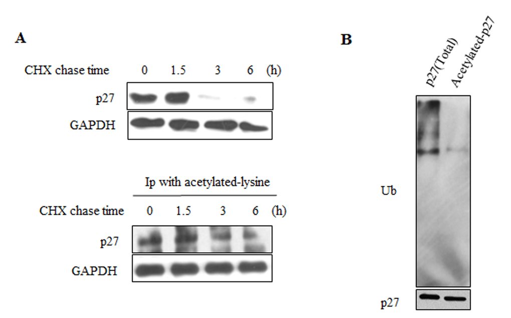 For preparing the total p27 protein, the cell extracts were immunoprecipitated with a p27 antibody. For preparing the acetylated p27 protein, the cell extracts were first IP by the acetylated-lysine antibody and then immunoprecipitated by the p27 antibody.