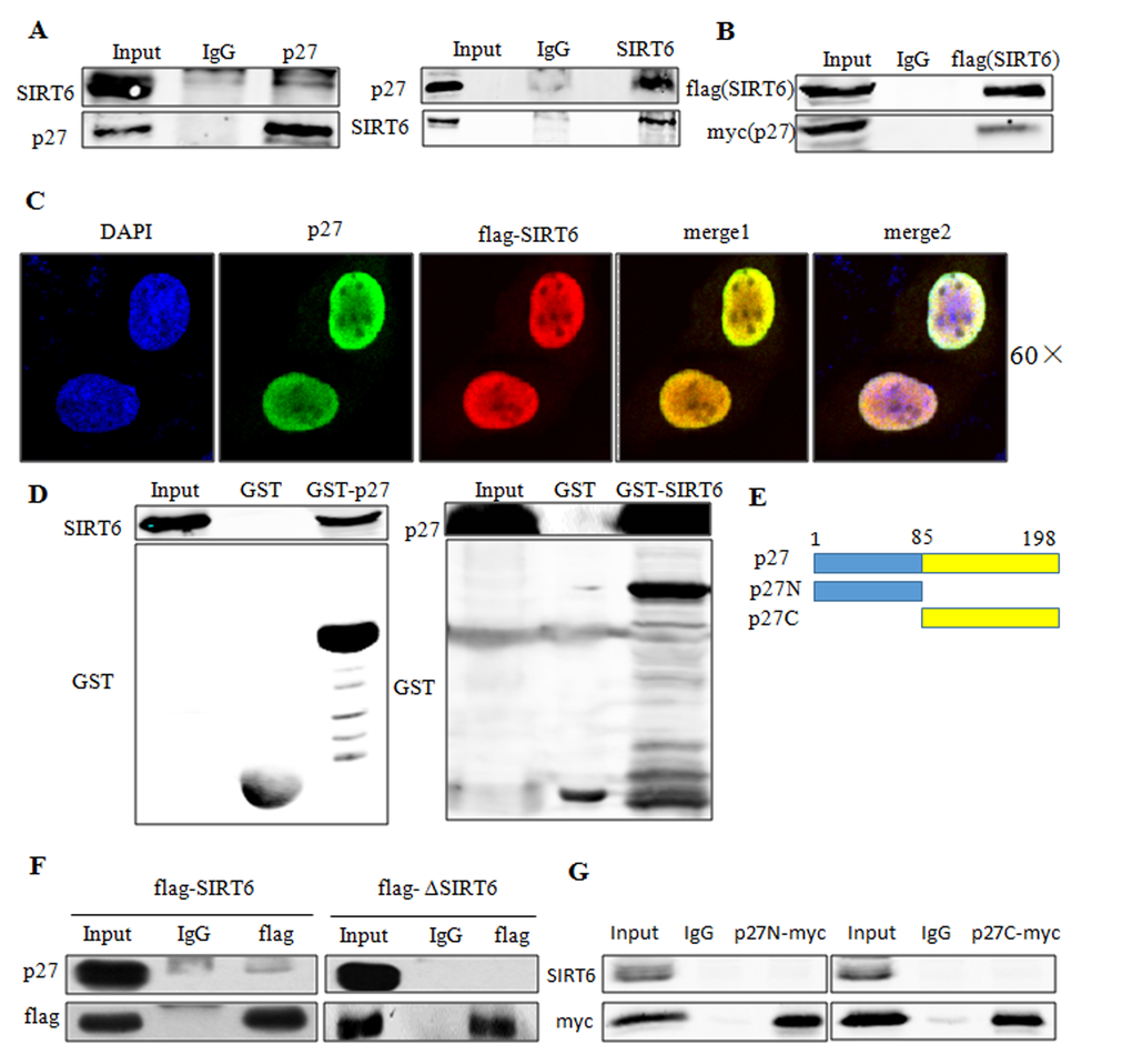 As SIRT6 can decrease the acetylation of p27, we next sought to determine whether this downregulation was depended on a direct interaction between SIRT6 and p27. As shown in Figure 7A, p27 could interact with SIRT6 in vivo. In addition, Co-transfection of flag-SIRT6 and myc-p27 in 293 cells revealed that exogenous SIRT6 could also interact with exogenous p27 (Figure 7B). Colocalization experiments showed that both SIRT6 and p27 mainly colocalized in the nucleus (Figure 7C). To further confirm the interaction of p27 and SIRT6, we performed a GST pull down assay using in vitro transcribed and translated p27 or SIRT6 and purified GST-SIRT6 or GST-p27. As shown in Figure 7D, SIRT6 displayed a strong association with p27 in vitro.