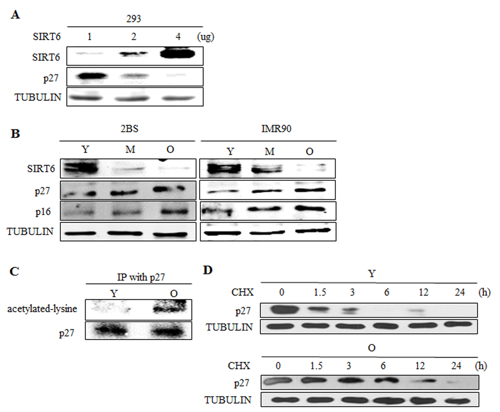 SIRT6 expression level inversely correlates with p27 acetylation level and its protein half-life during cellular senescence