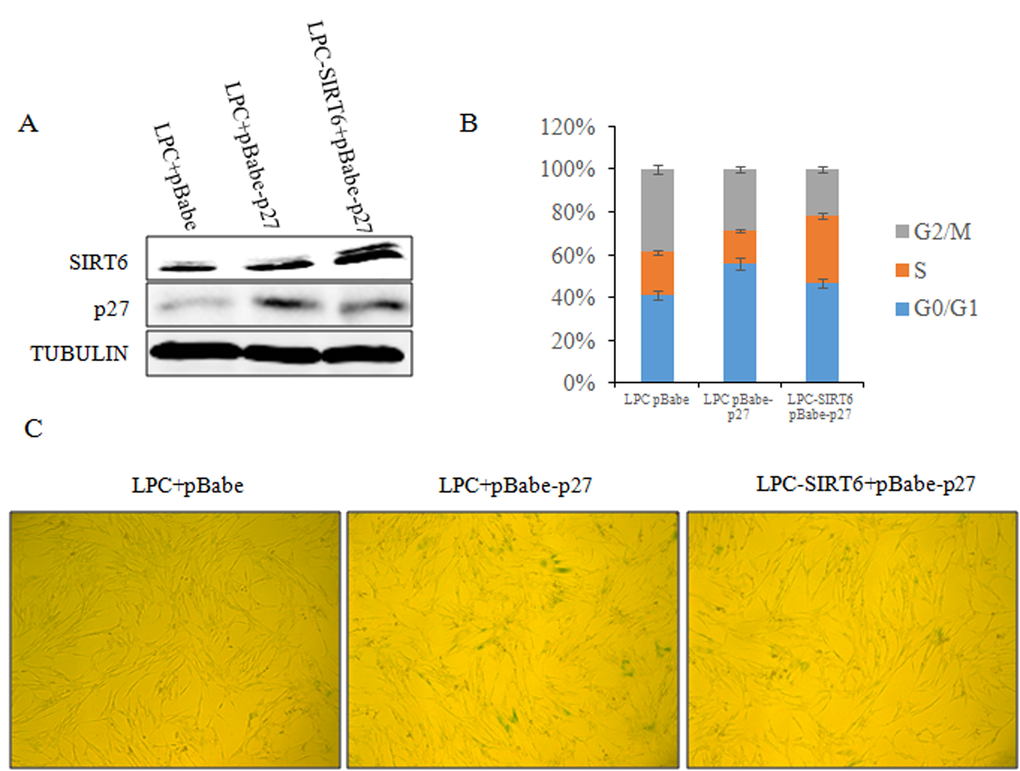 Given the critical role of p27 in SIRT6-mediated cellular senescence, we investigated whether SIRT6 delays the cellular senescence induced by p27. As shown in Figure 9, 2BS cells co-expressing pLPC, pBabe-p27 exhibited G1 arrest and higher SA-β-gal activity. Concurrently, the senescent markers of SIRT6-p27 appeared to be comparable with that of pLPC-pBabe control cells (Figure 9B and 9C). These findings strongly suggest that SIRT6 inhibited p27-induced senescence. Thus, the decrease of p27 mediated by SIRT6 is required for the restriction of cellular senescence.