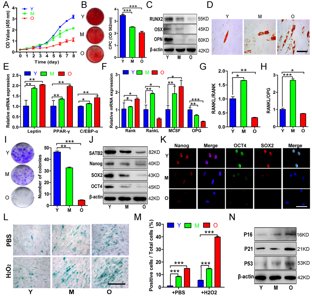 Trabecular bone of mandible was obtained from volunteer donors when they received impacted tooth extraction or dental implantation at our hospital. All volunteers were categorized into young group (Y, 19-27 years old), middle-aged group (M, 32-47 years old) and old group (O, 60-84 years old) according to age. Informed consent was obtained before volunteers enrolled in this study. Human BMSCs from mandibular bones were obtained according to previous methods [10,42]. BMSCs were cultured in 25cm2 cell culture flasks with medium consisting of Dulbecco’s modified Eagle’s medium (DMEM) (Gibco Life Technologies, NY, USA), 100 U/ml penicillin and 100 μg/ml streptomycin, 10% fetal bovine serum (FBS) (Hyclone, Logan, UT, USA) at 37°C maintained in 5% CO2. BMSCs were confirmed by positive expression of MSC markers CD29, CD 90, CD105 and negative expression of hematopoietic markers CD34, CD45 (Supplementary Figure S1).