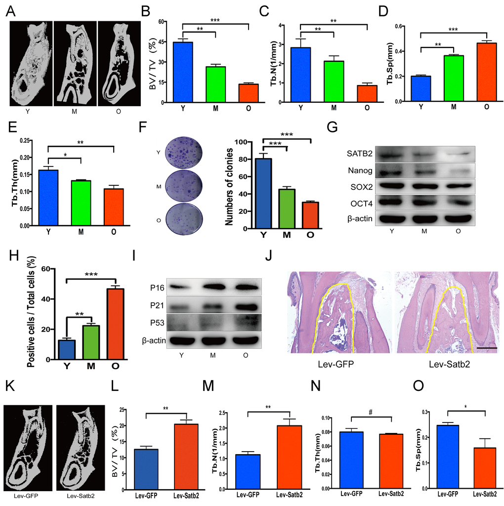 All procedures were carried out according to the guidelines of the Animal Care Committee of Nanjing Medical University. As we described previously [43], BMSCs derived from mandibular were isolated from young group (3 months old), middle-aged group (12 months old) and old group (18 months old) male Sprague-Dawley (SD) rats. 15 months old SD rats were transplanted with green fluorescent protein (GFP) modified or SATB2 enforced BMSCs (1 × 107) by tail vein at week 2, 6, and 12 after micro-CT scan. Rats were killed at week 14 (n=5 per group).