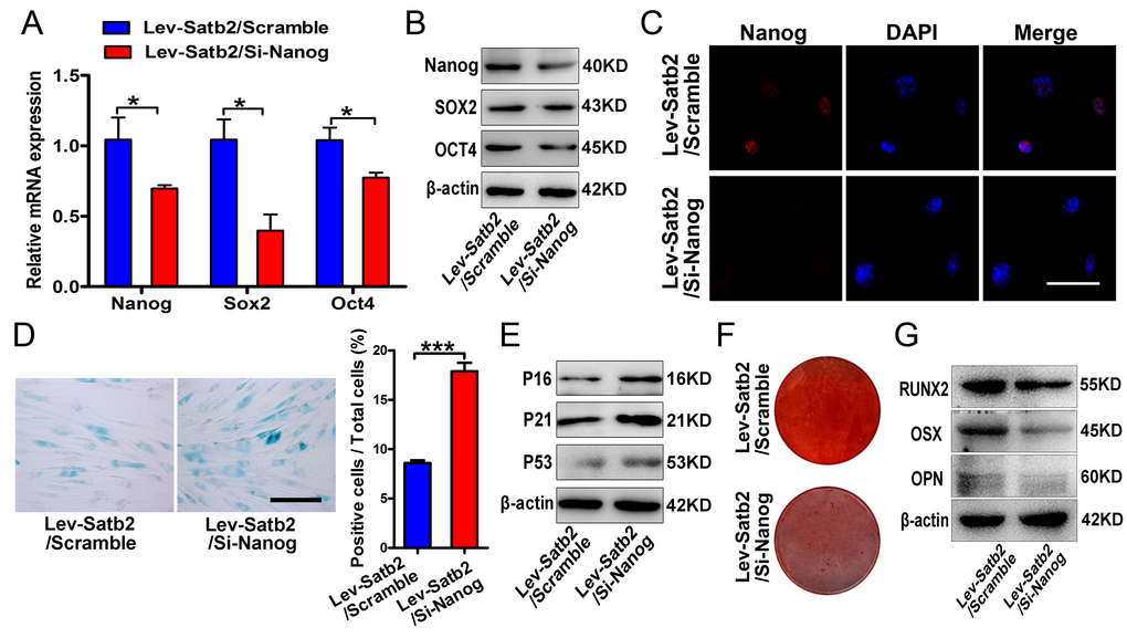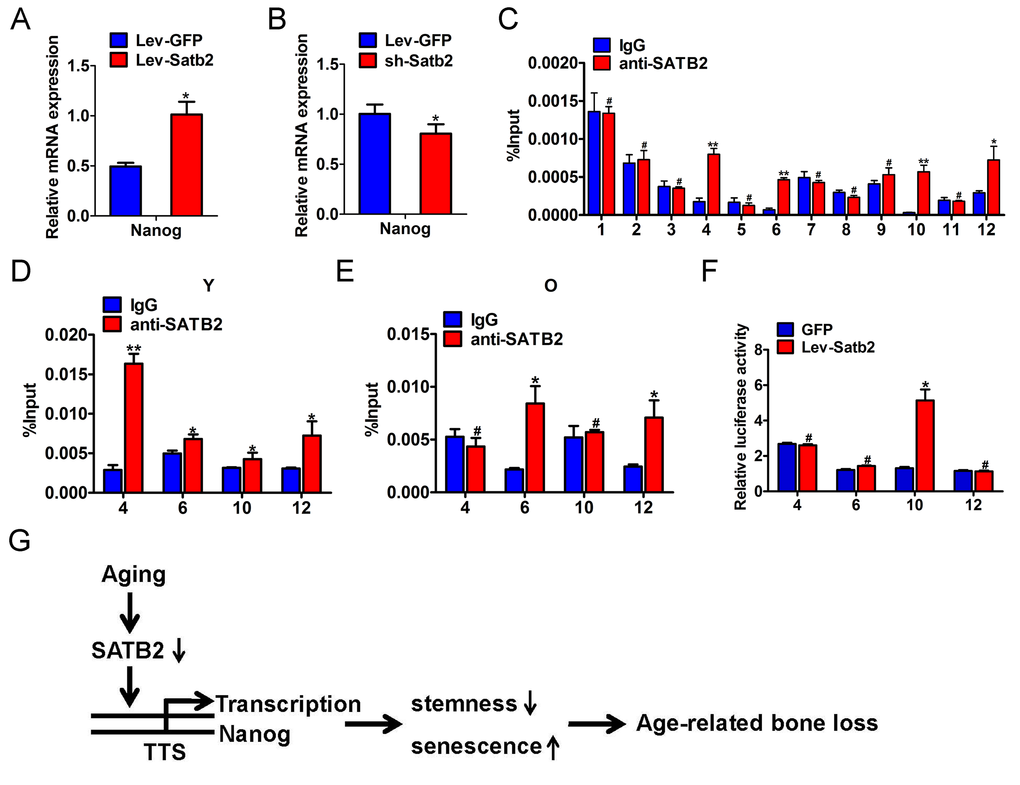 Taken together, based on our abovementioned data and previous literature, we propose that reduced SATB2 in aged AB-BMSCs was partially responsible for these age-related properties of AB-BMSCs. Nanog might be one of downstream effectors of SATB2 via direct transcriptional region underlying this biological process (Figure 6G).